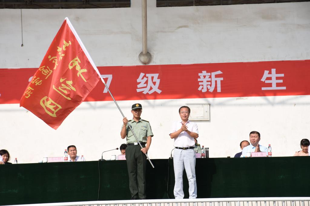开营式在雄壮的国歌声中拉开了序幕。唐勇向军训团授团旗,并作了军训动员讲话。他首先代表学校向承接本次军训任务的部队表示衷心的感谢,并向全体参训官兵和2017级新生介绍了学校的基本情况和改革发展进程;最后,他要求全体参训学生要以饱满的热情、乐观的态度和坚强的毅力迎接军训中的各种挑战,圆满地完成军训任务,在军训阅兵式汇演时以优异的表现为学校献礼!