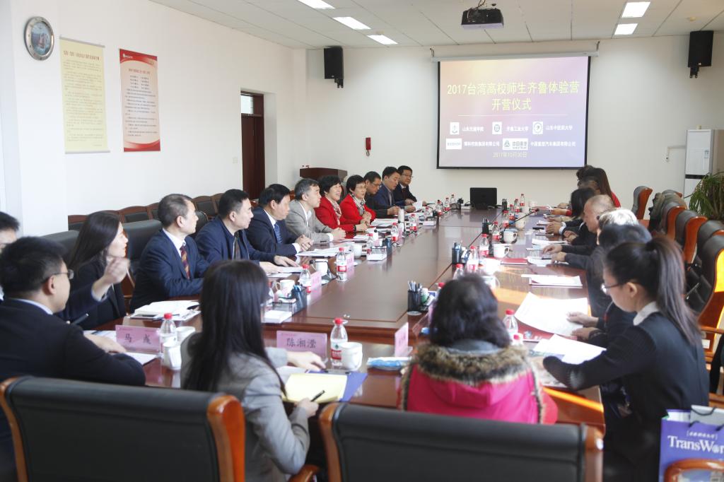 10月30日下午,2017台湾高校师生齐鲁体验营开营仪式在我校长清校区635会议室举行,台湾环球科技大学董事长许舒敏率领的师生代表团一行12人来山东参加体验交流活动。我校党委书记孙秀丽、副院长徐晓红,山东省人民政府台湾事务办公室副巡视员王清玉、山东省人民政府台湾事务办公室交往交流处副调研员周瑞鹏,齐鲁工业大学副校长刘孟德,山东中医药大学港澳台事务办公室主任梁红卫,山东博客控股集团董事长甘宜梧应邀出席仪式。兄弟院校、企业相关处室负责人以及我校港澳台事务办公室、继续教育学院负责同志参加了开营仪式。仪式由徐晓红主持。