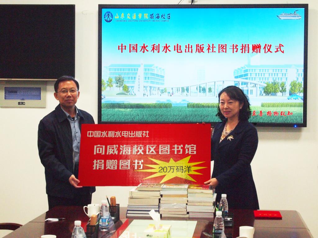 11月2日,中国水利水电出版社万水出版分社社长杨庆川等一行3人来到威海校区,向威海校区图书馆捐赠了727品种2800册20万码洋的图书。学校副院长、威海校区党委书记、管委会主任姜华平出席了捐赠仪式,代表学校接受了图书捐赠并为出版社颁发了捐赠证书。
