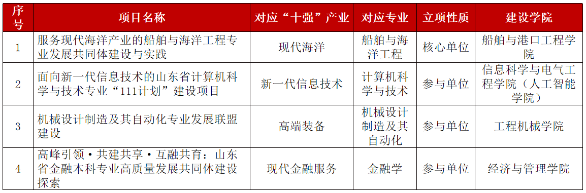 近日,山东省教育厅公布了2023年山东省普通本科高校重点领域教学改革试点项目立项名单(“111”计划)。我校4个项目获批立项(全省共立项建设10项),其中,我校作为核心单位与哈尔滨工业大学(威海)等联合申报获批1项,作为参与单位分别与山东大学、青岛大学、山东财经大学等联合申报获批3项。
