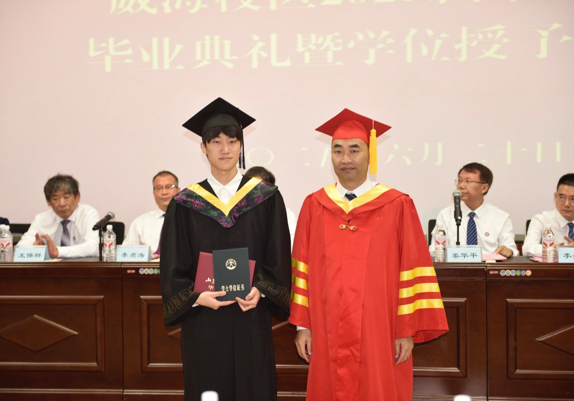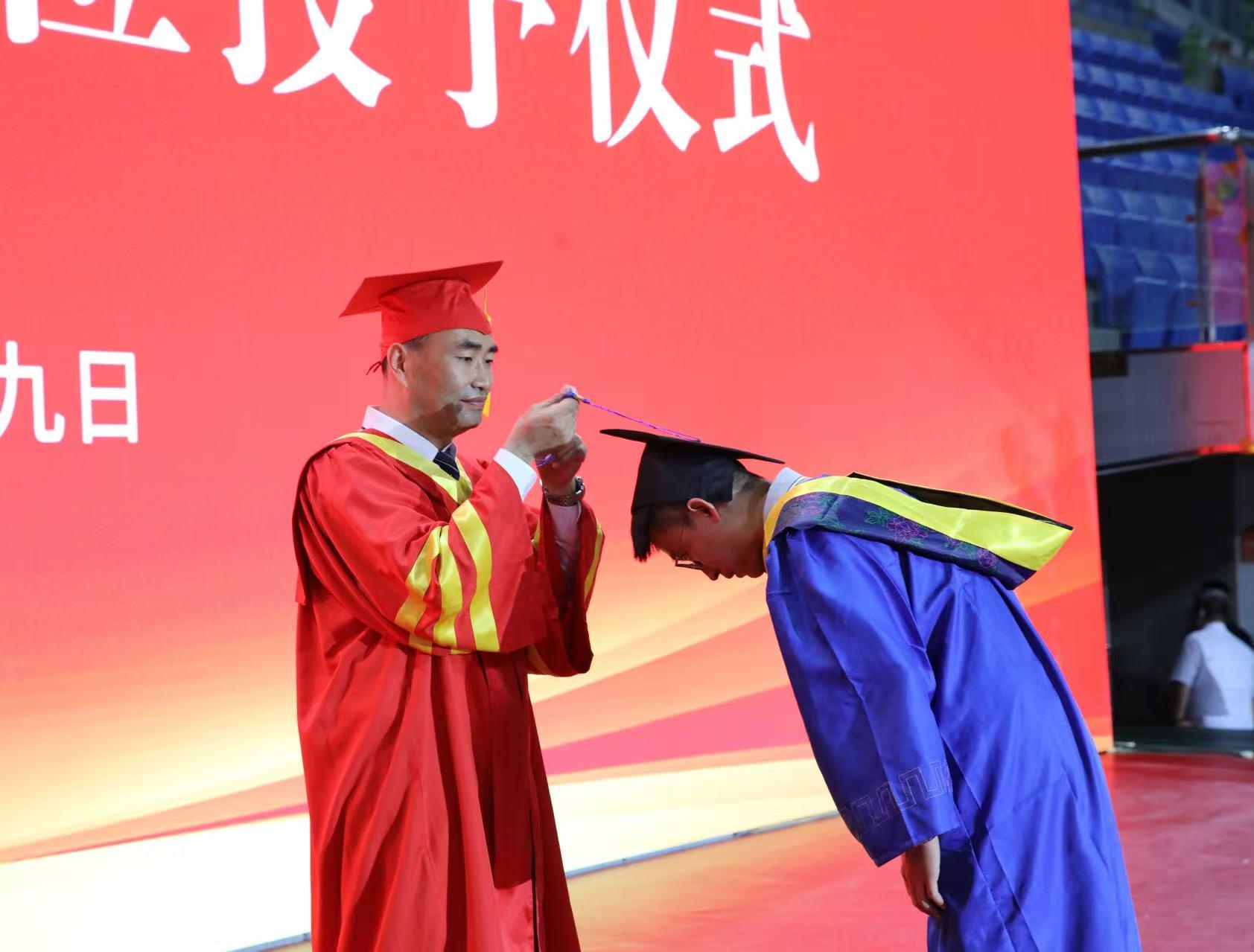 孔伟金为优秀毕业生代表正冠拨穗,并颁发毕业证书、学位证书。