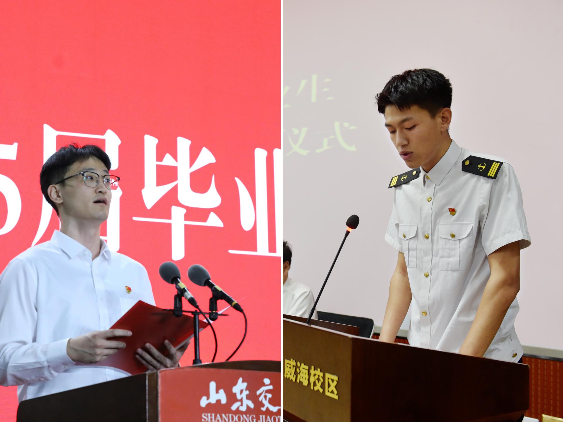 教师代表信息科学与电气工程学院教师朱振方、船舶与港口工程学院教师樊鑫对即将踏上新征程的毕业生送上祝福和希望,勉励同学们将热爱与奋斗相结合,在中华民族伟大复兴新征程中挺膺担当。