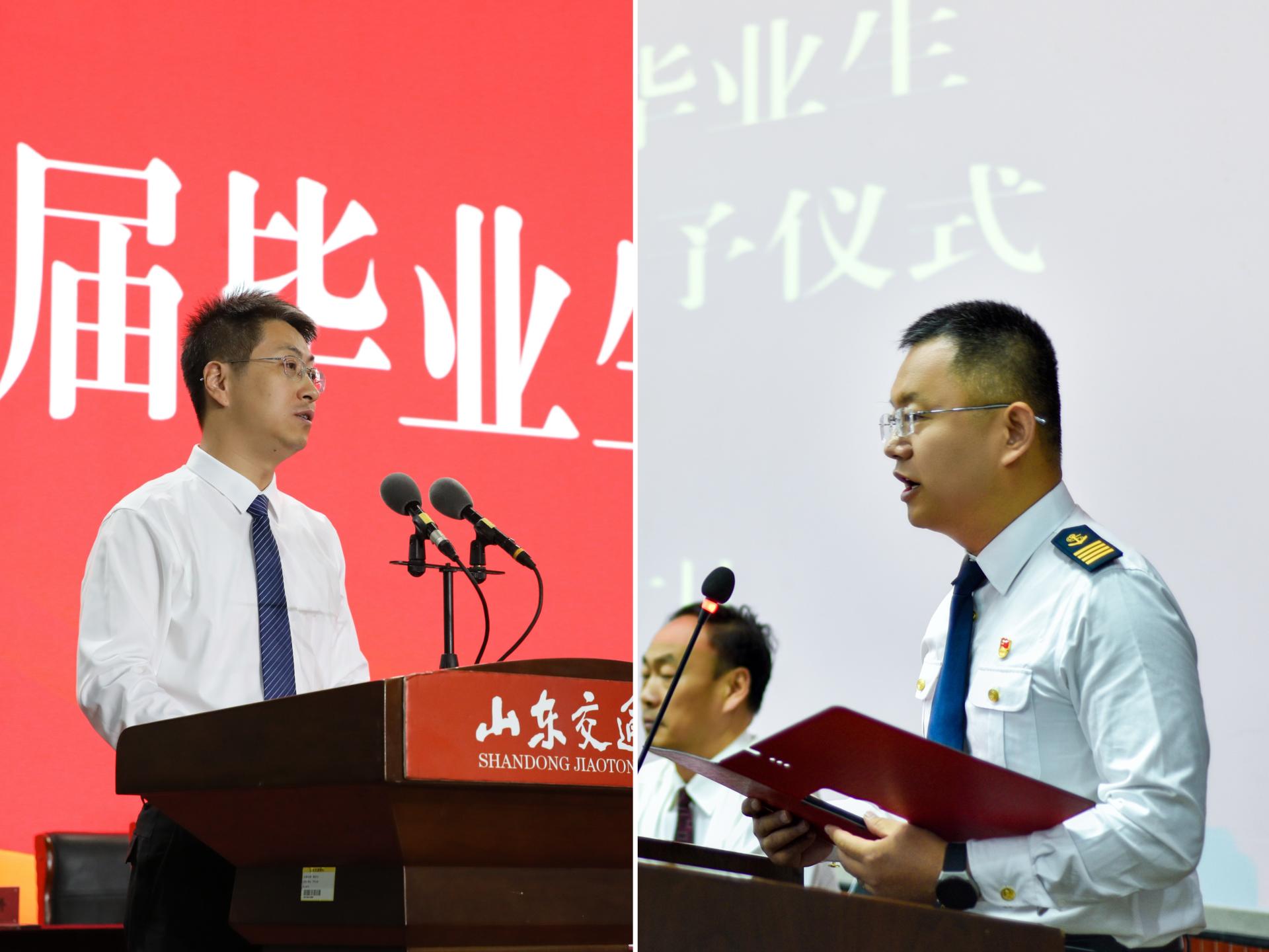 校友代表德州市宁津县县委副书记、我校市场营销专业2007届校友金栋,“山东交通大工匠”“山东省技术能手”称号获得者、我校船舶驾驶专业1998级校友王有顺分享了在校期间的工作和生活感悟,勉励同学们锚定方向、聚力前行、守正创新,珍惜时代机遇,用奋斗书写美好人生。