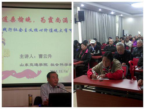 11月14日上午,离退休工作处分党委在学校无影山校区交流中心举行党课学习活动,邀请学校社科部曹云升教授作了题为《莫道桑榆晚,为霞尚满天——践行社会主义核心价值观大有可为》的专题学习讲座,离退休工作处分党委近50名党员参加了学习活动。 讲座中,曹云升教授以社会生活中的实例,从社会主义核心价值观的解读、以实际行动践行核心价值观、打造阳光心态享受幸福人生三个方面,深入浅出地阐释了社会主义核心价值观的深刻内涵和践行社会主义核心价值观的现实意义。受到了我校离退休老同志的热烈欢迎。(离退休工作处 文/魏丙刚) |