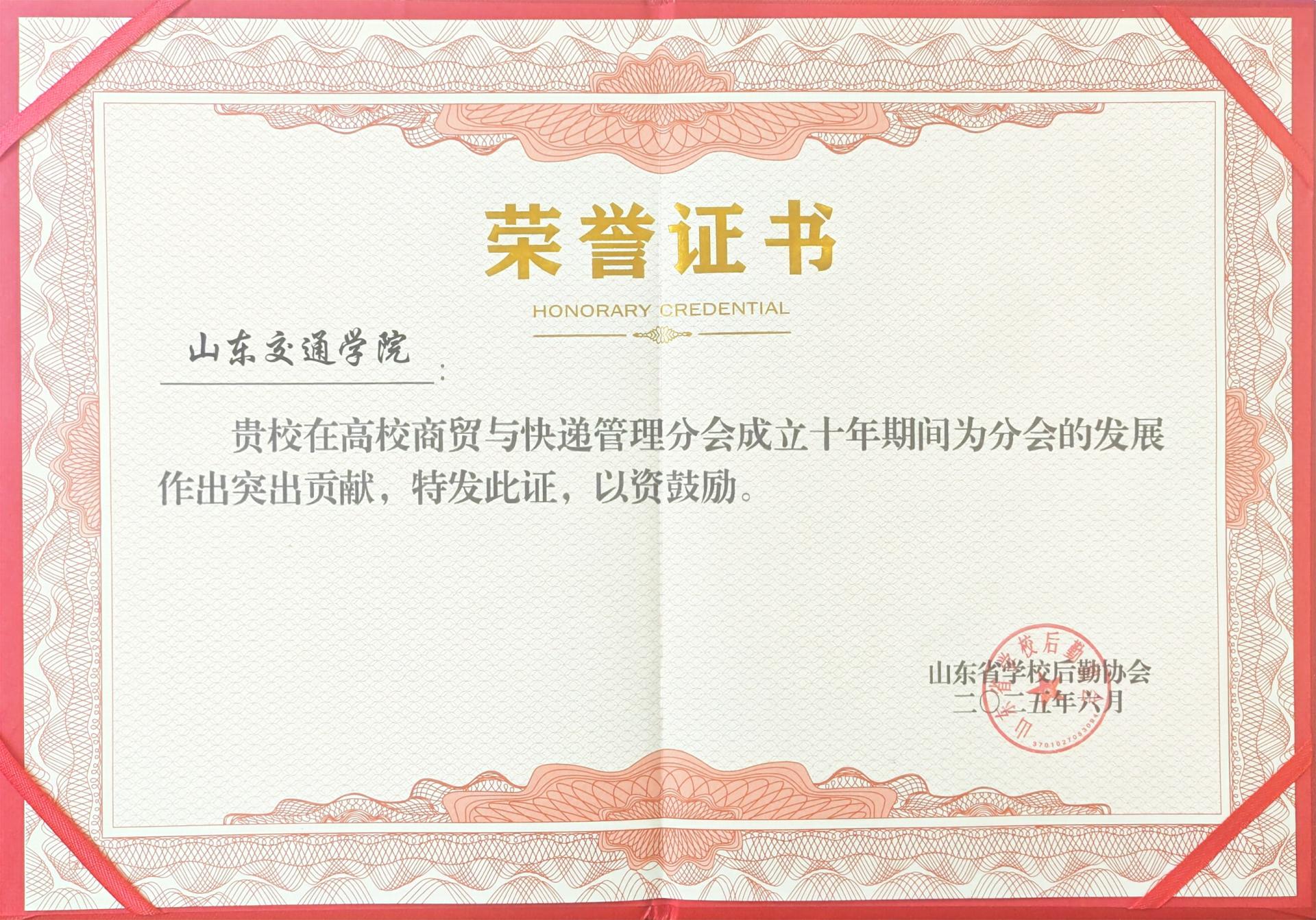 近日,山东省学校后勤协会高校商贸与快递管理分会成立十周年纪念座谈会在济南市举办。我校在高校商贸与快递管理分会成立十年期间为分会的发展作出突出贡献,获荣誉证书。