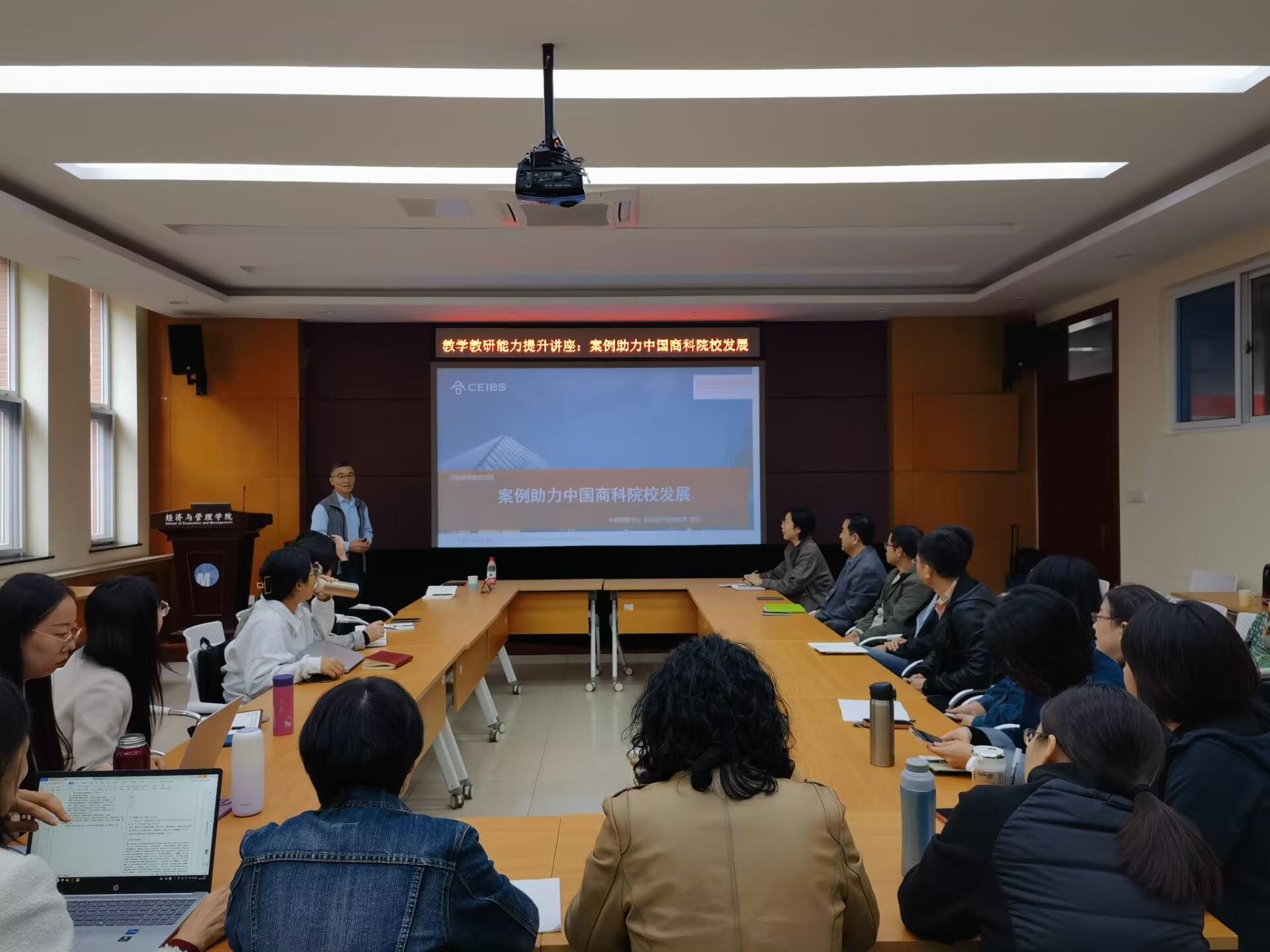 10月16日,经济与管理学院在长清校区1号教学楼B104举行教学教研能力提升讲座,邀请中欧国际商学院案例中心院校合作经理樊东作专题讲座。经济与管理学院院长耿中元参加活动。