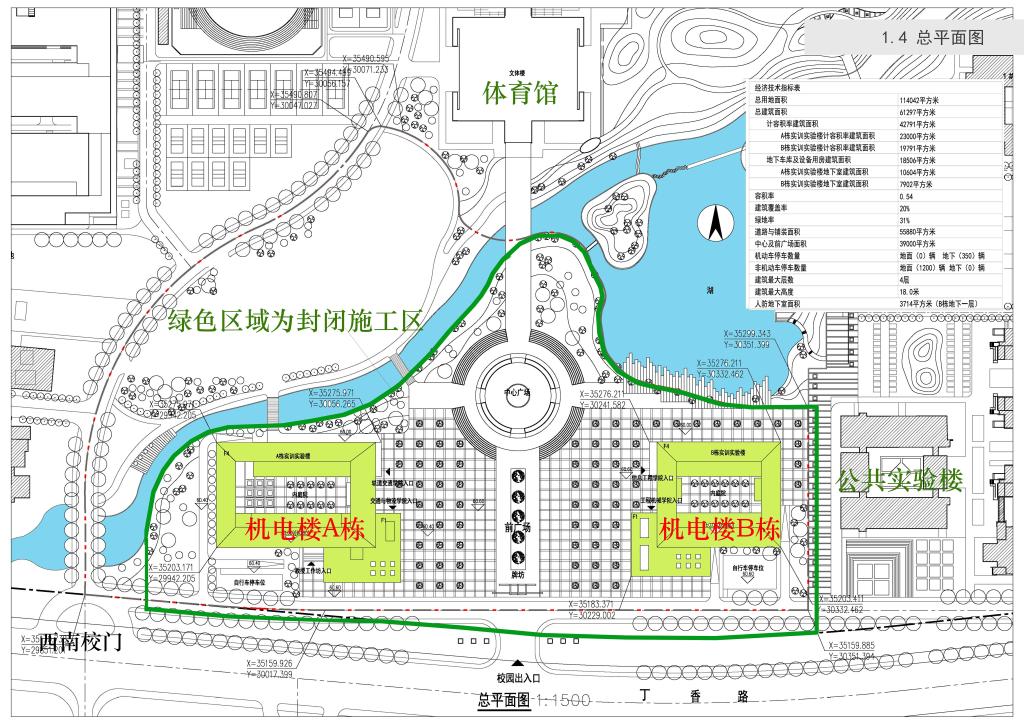我校交通机电教学实验实训楼项目即将开工,为保证施工安全,相应施工场地将进行封闭,封闭范围如下(见附图):东至公共实验楼西侧,西至学校西南入口东侧,北至景观河道与湖区的南岸,南至学校围墙。学校南侧主环路也同时阻断通行。封闭施工时间暂时定为:2018年12月03日---2020年5月13日。