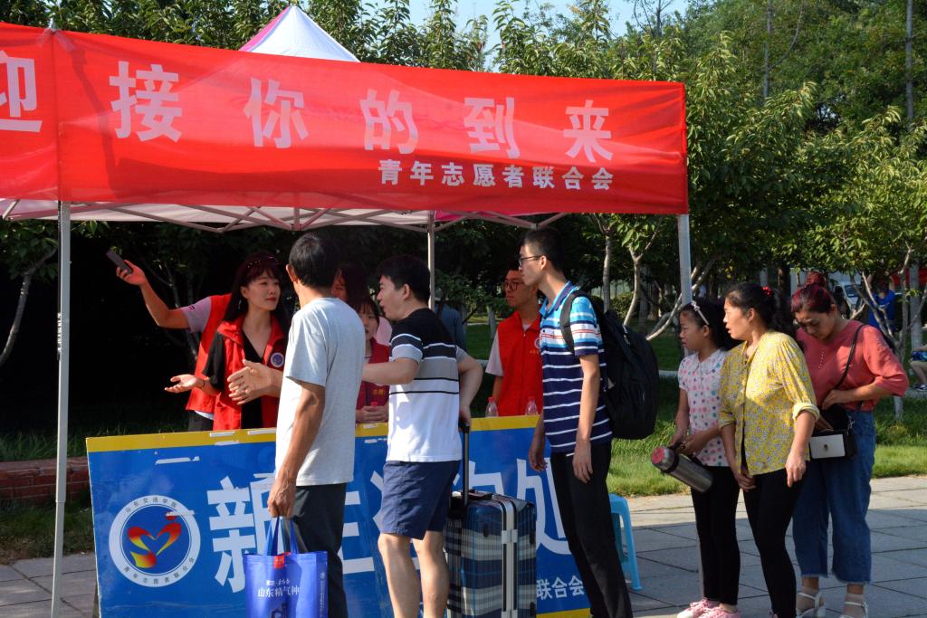 图为LT.COM乐投长清校区迎新现场,志愿者在为新生和家长指路。记者 王凯 摄影