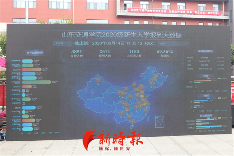 今年山东交院的迎新到处都体现了线上互通和大数据。在该校食堂前的小广场上,还竖立了一块大电子屏,上面显示着报到当天的实时数据,包括录取人数、已报到人数、未报到人数、报到率,还有各校区和二级学院报到率、性别比例等,甚至几点几分几秒哪名新生完成报到的信息都在实时滚动。