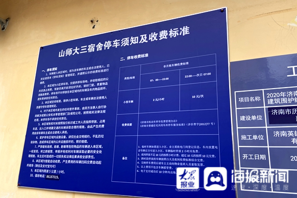 济南市明确规定停车场收费必须要在显著位置公开悬挂收费标准。图为山师大三宿舍停车须知及收费标准。(摄影:满倩倩)