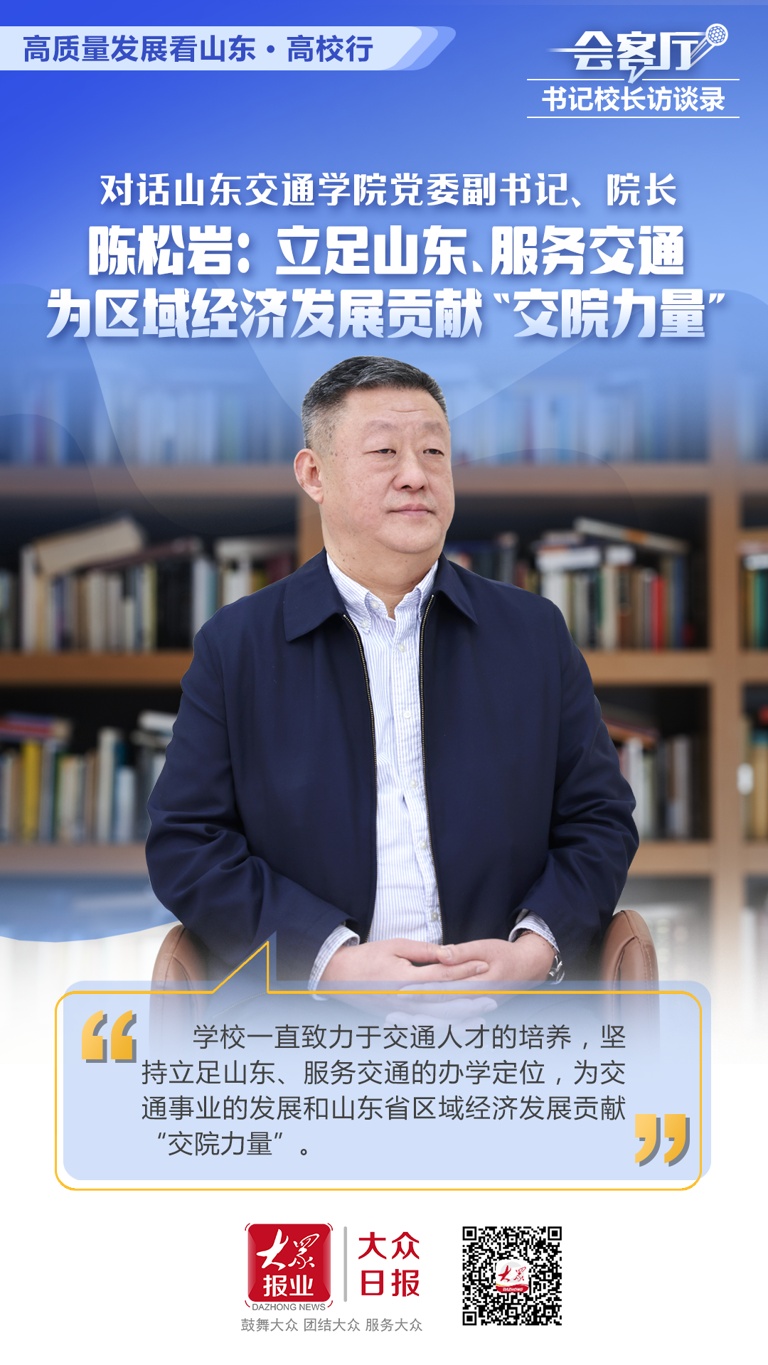 高质量发展是时代最强音。2020年,山东高等教育在2019年全面起势基础上,乘势而上,紧紧围绕八大发展战略和“十强”产业,高歌猛进,涌现出一大批“高质量发展”的典型高校。为更好服务我省高质量发展,形成叫得响、可复制的经验,山东省教育厅与大众日报联合发起“高质量发展看山东·高校行”大型主题活动,同时重磅推出“会客厅·书记校长访谈录”系列专访栏目。