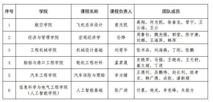 六门课程分别为《飞机总体设计》《宏观经济学》《机械设计基础》《轮机工程材料》《汽车保险与理赔》和《人工智能基础》。
