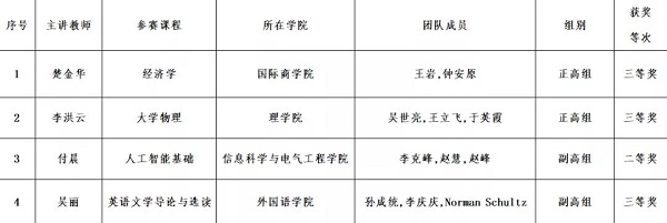 经过激烈角逐,信息科学与电气工程学院(人工智能学院)副教授付晨获得二等奖,理学院教授李洪云、国际商学院教授楚金华、外国语学院副教授吴丽获得三等奖。