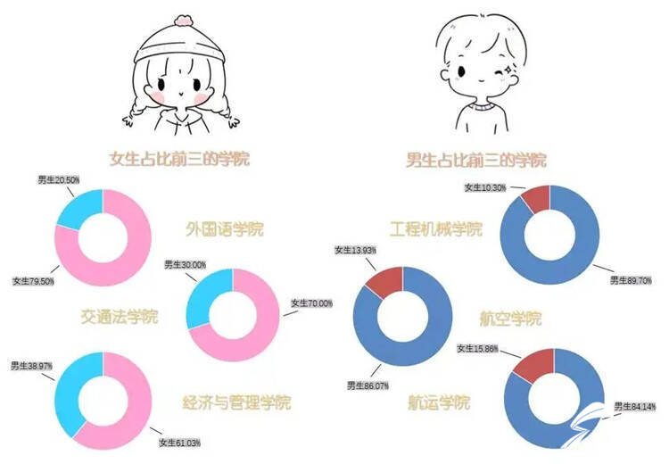 新生中男生有3651人,女生有1575人,女生人数有所提升,总体男女比约为7:3。各学院男女生比例中,男生比例最高的是工程机械学院,其次是航空学院,排名第三是航运学院;女生比例最高的是外国语学院,其次是交通法学院,排名第三是经济与管理学院。