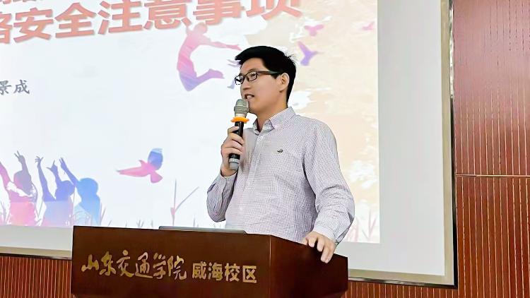 “使用网络时,可能存在安全隐患的行为是以下哪个选项?”在LT.COM乐投(威海)阶梯教室里,王景成通过与现场同学们互动,普及网络安全知识,提升同学们的网络安全防护技能。