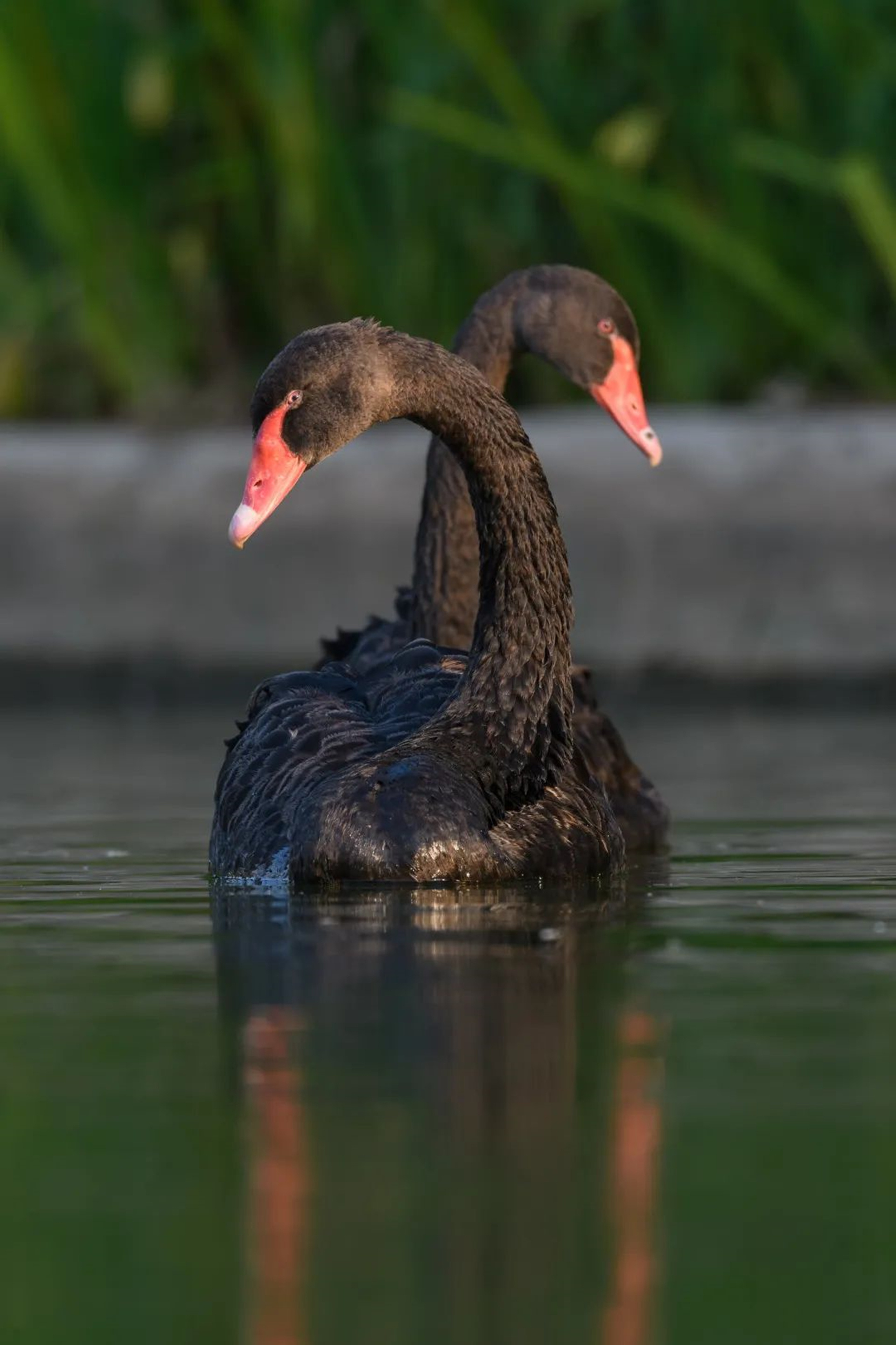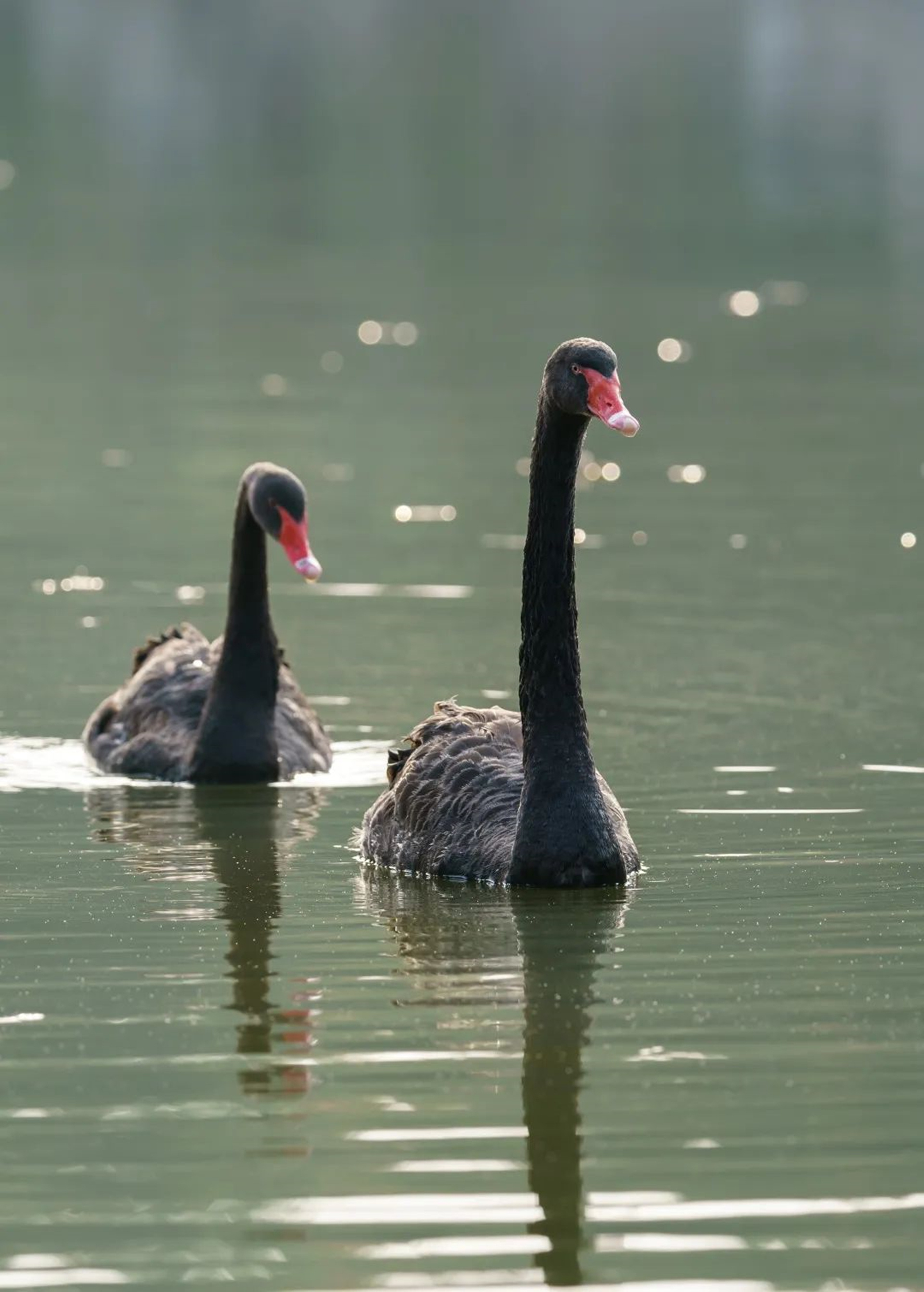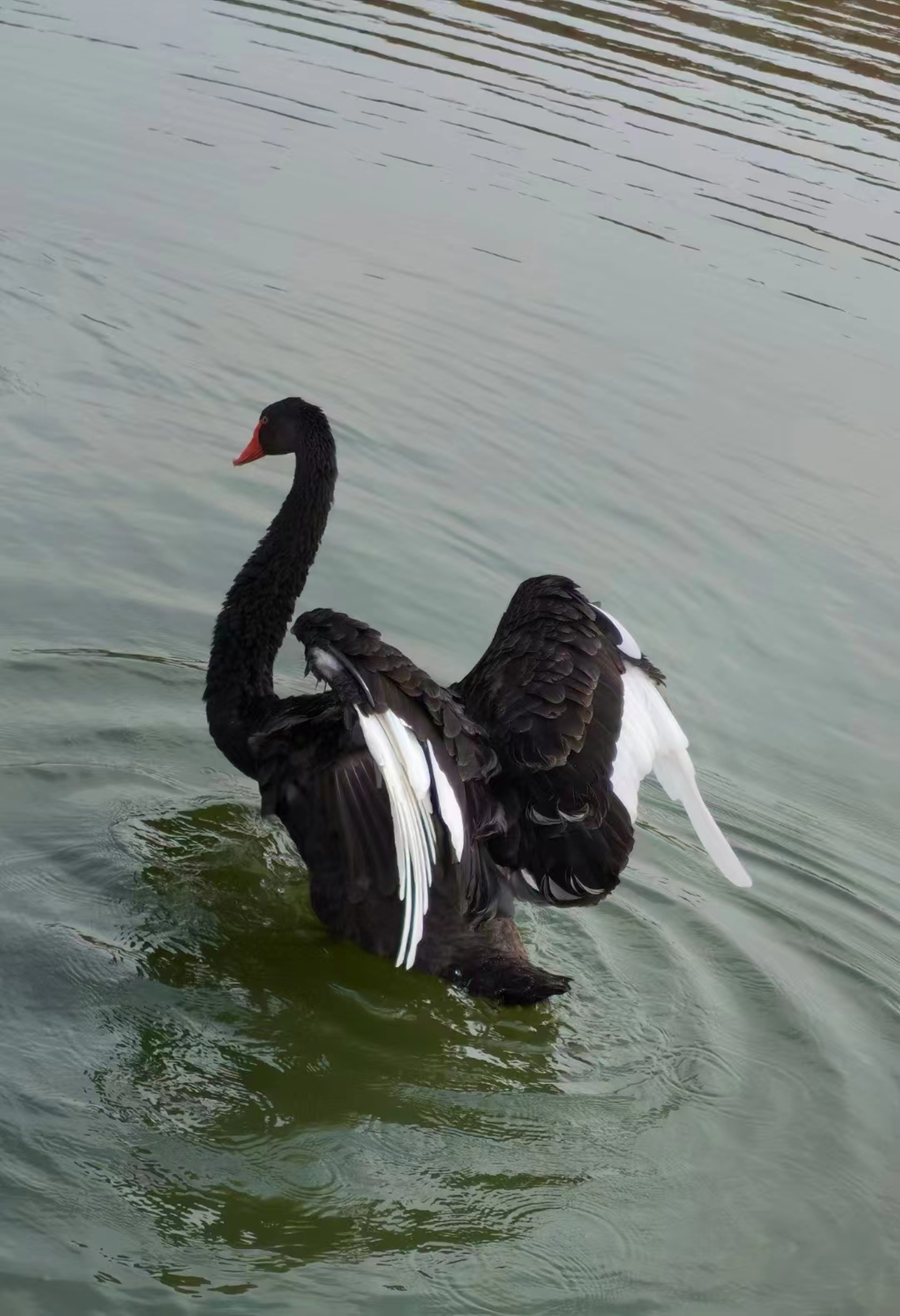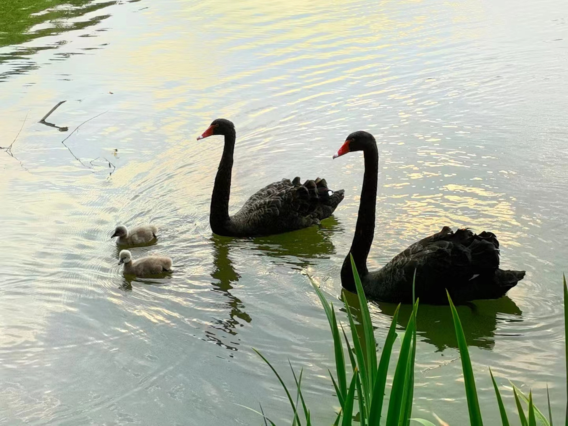 在LT.COM乐投长清校区的文昌湖里,两只毛绒绒的小天鹅跟随在“黑天鹅爸爸”“黑天鹅妈妈”身后游弋觅食,真可爱!
