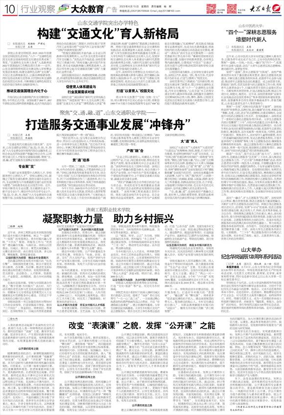 该校党委书记王焕斌说:“迈向新征程,校园文化建设有了新要求,要以学校交通特色文化品牌为主线,将‘六个一’交通特色文化景观、汽车文化博物馆、‘山东手造’木工坊等交通文化育人载体串珠成链,深挖蕴含交通特色文化精神的标志性人物、事件、器物,让校园文化迸发出应有的文化感染力和思想引导力,进而提升思想政治教育实效性。”