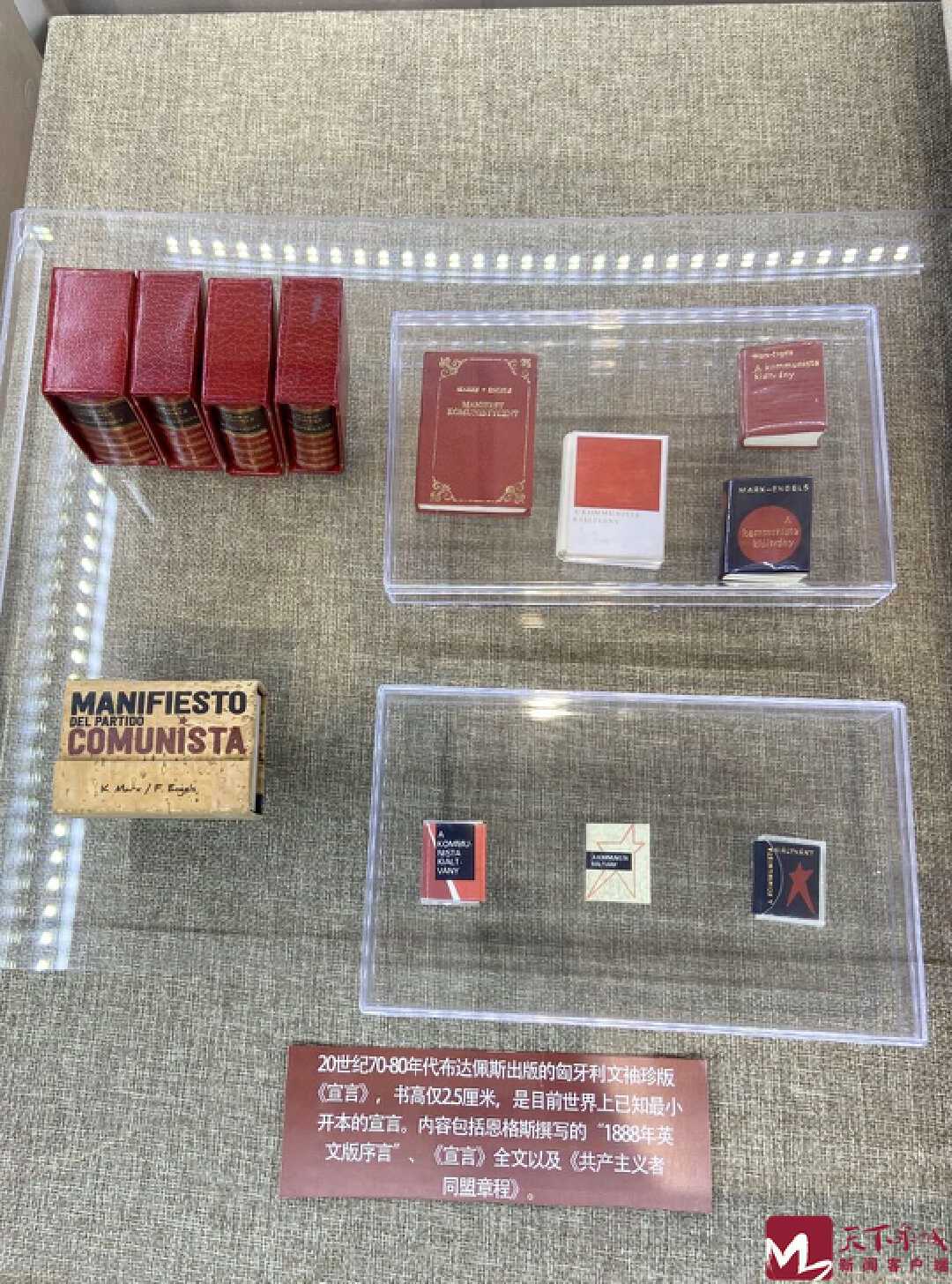 此外,主题馆内不乏各种珍善版本,如作者写序言的1882年俄文版和1890年德文版、1891年保加利亚文版和1892年荷兰文版,都是所在国家的首译本。除《共产党宣言》外,还有几十种1895年前出版的马恩著作,包括《资本论》、《法兰西内战》、《英国工人阶级状况》等。展馆内还有一些特殊版本,如中文、德文两种版本盲文版以及世界上最大的开本和多种袖珍版,其中最小一种书高仅有2.5厘米。