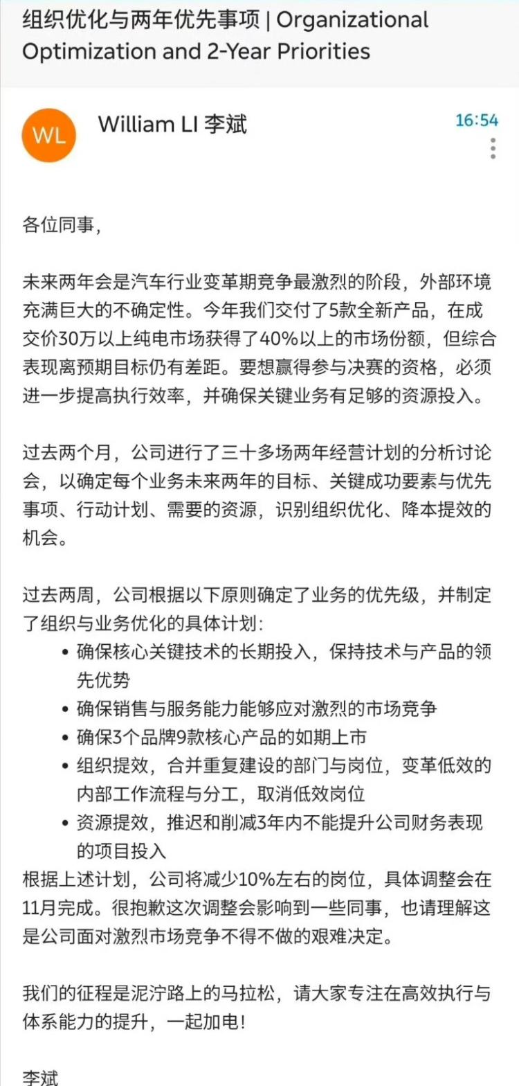 随着车市竞争的白热化,车市的分化和淘汰赛正加速进行。合资车企的日子不好过,新势力也在“节衣缩食”。今年11月3日,蔚来董事长、CEO李斌发出了一封全员信,宣布将裁员10%,具体调整会在11月完成,这封信也被业内称为“国内新能源汽车行业的第一股‘寒气’”。