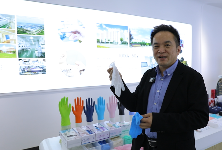 山东淄博,蓝帆医疗防护事业部副总经理刘大广向记者展示最新生产的出口医用手套,如今其主要出口增量来自新开拓的非美市场。