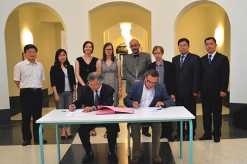 图为孙云早与比利时哈赛尔特大学校长卢克•德•斯其博教授签署协议