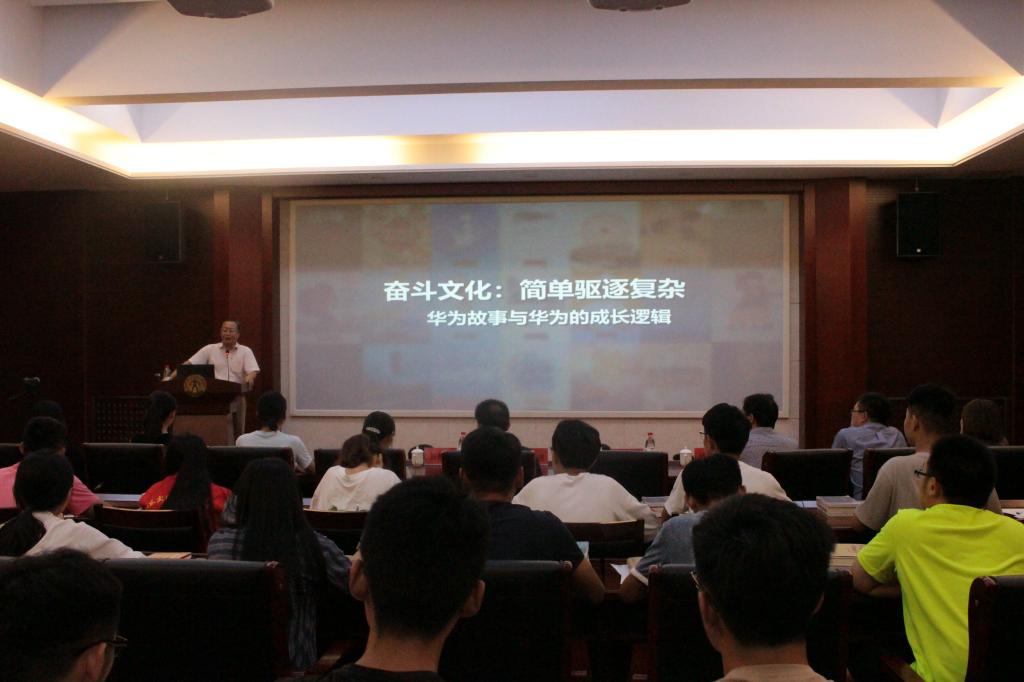 周明成作题为《奋斗文化:简单驱逐复杂——华为故事与华为的成长逻辑》的讲座,主要围绕华为公司的发展、华为公司取得成功的原因以及华为公司的文化三方面做了分享。他鼓励在场大学生将青春奋斗、创造价值作为自己的责任与义务,并向每人赠送了《厚积薄发》《黄沙百战穿金甲》《枪林弹雨中成长》《下一个倒下的会不会是华为》四本书。