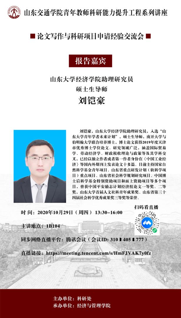 刘铠豪,山东大学经济学院助理研究员,入选“山东大学青年学者未来计划”,硕士生导师,南开大学与伯明翰大学联合培养博士,博士论文获得2019年度天津市优秀博士学位论文。研究领域广泛,涵盖国际贸易学、劳动经济学、财政税收理论与政策等及其学科交叉,已经以独立作者或者第一作者身份在《中国工业经济》等国内外期刊上发表论文十多篇。目前主持国家自然科学基金青年项目、山东省重点研发计划(软科学项目)重点项目、山东省社会科学规划研究项目、中国博士后科学基金特别资助项目和面上资助项目等多个项目,曾获中国平安励志计划经济组论文一等奖、二等奖,山东大学首届人文社科青年成果奖、山东省第三十四届社会科学优秀成果奖三等奖等荣誉。