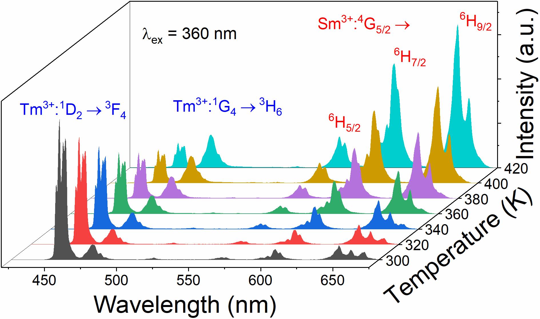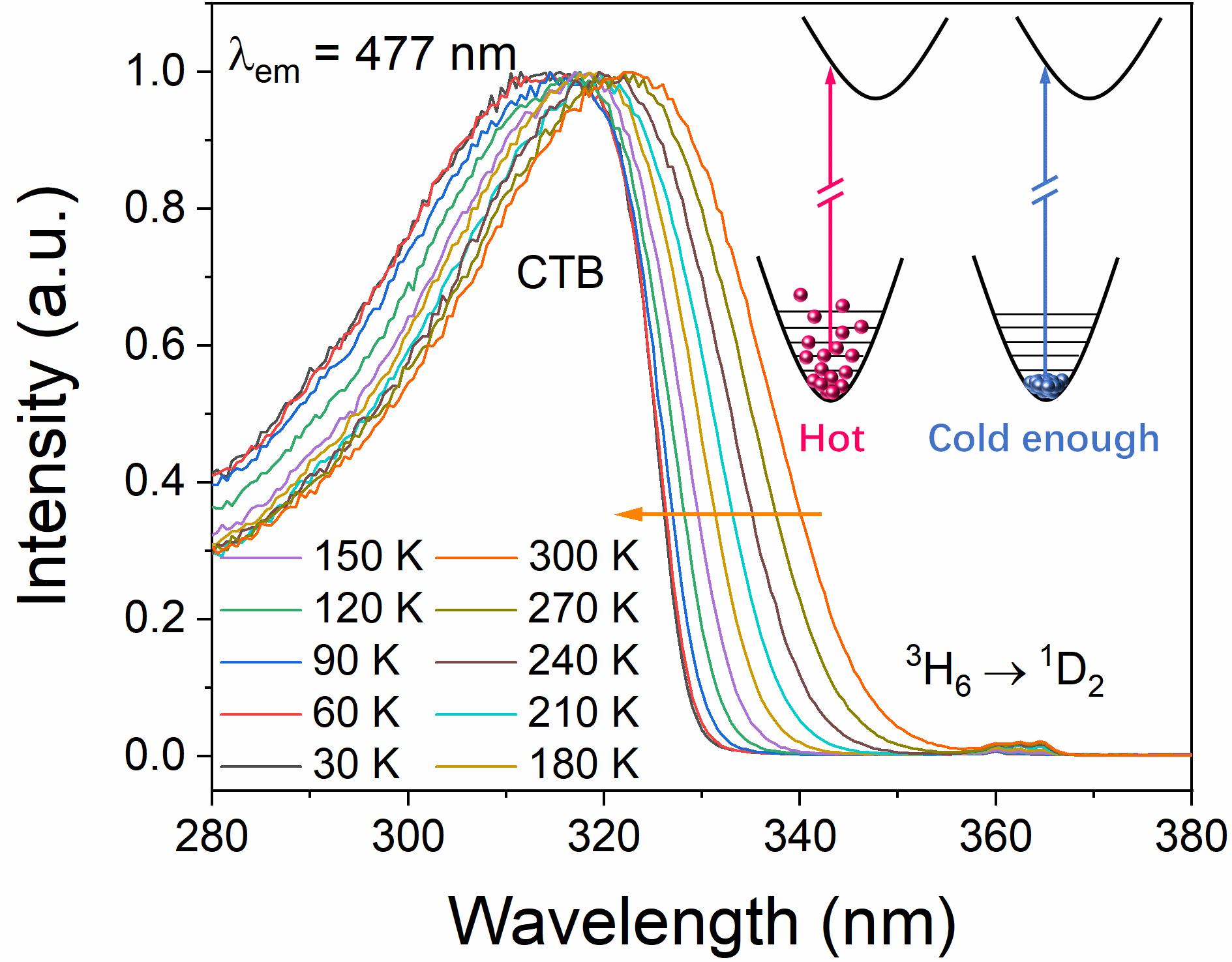 基于温度诱导电荷迁移带带边移动的测温策略有望实现高灵敏的非接触式光学温度探测,具备一定的潜在应用价值。通过研究YVO4基质中钒氧电荷迁移带在低温下的热行为,为温度诱导钒氧电荷迁移带带边移动提供了更加直接的实验解释,并利用带边移动与Tm3+的荧光温度猝灭构建了高灵敏的荧光强度比测温策略。下图依次为低温下的归一化变温激发光谱以及在360 nm激发下实现剧烈的荧光强度比温度依赖。该工作进一步加深了对温度诱导金属-氧电荷迁移带带边移动机理的认识和理解,并为探索高灵敏光学测温方案提供了新的思路。