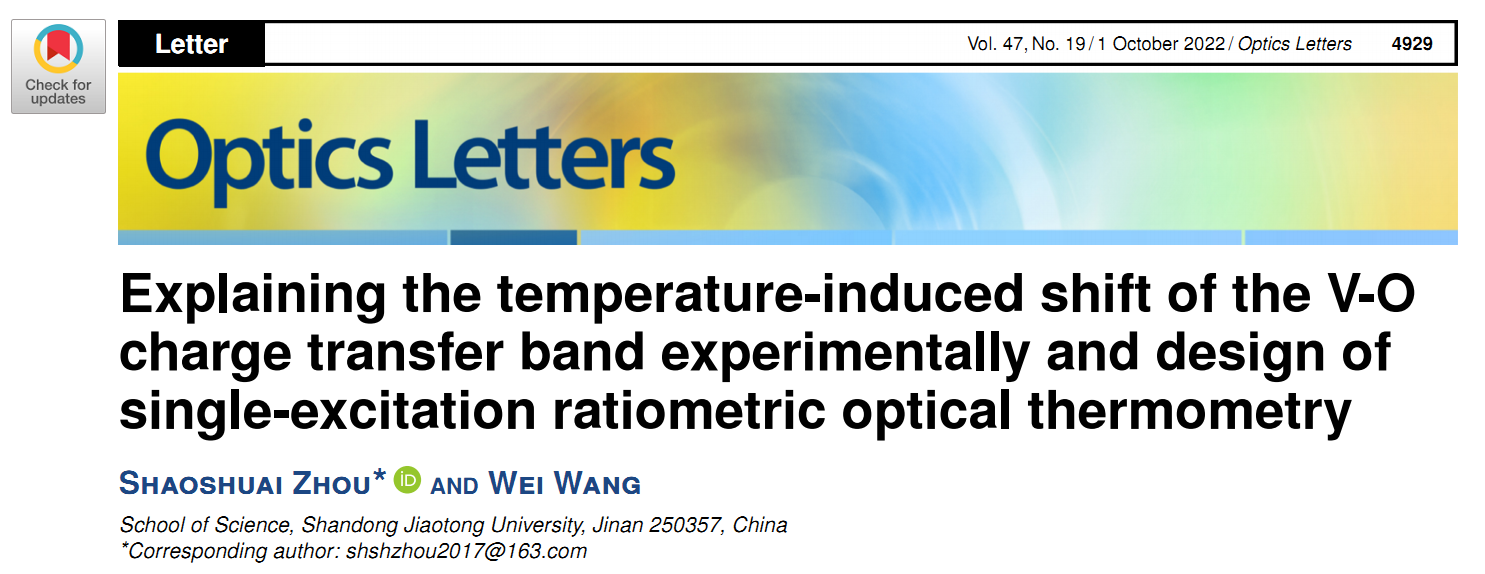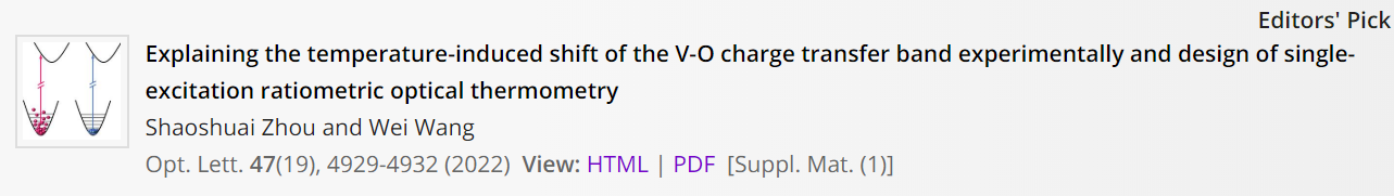 我校理学院周少帅副教授在温度诱导钒氧电荷迁移带带边移动机理的实验解释与高灵敏荧光温度探测方面取得重要进展,研究成果以“Explaining the temperature-induced shift of V-O charge transfer band experimentally and design of single-excitation ratiometric optical thermometry”为题在光学领域著名学术期刊Optics Letters发表,并被选为Editor's Pick(编辑精选)文章。