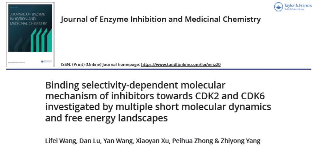 我校理学院王立飞教授在CDK2和CDK6两种蛋白的抑制剂选择性方面取得重要进展,研究成果以“Binding selectivity-dependent molecular mechanism of inhibitors towards CDK2 and CDK6 investigated by multiple short molecular dynamics and free energy landscapes”为题在生物物理领域著名学术期刊JOURNAL OF ENZYME INHIBITION AND MEDICINAL CHEMISTRY发表,该期刊属JCR分区1区,中科院分区2区,期刊影响因子为IF 5.756。