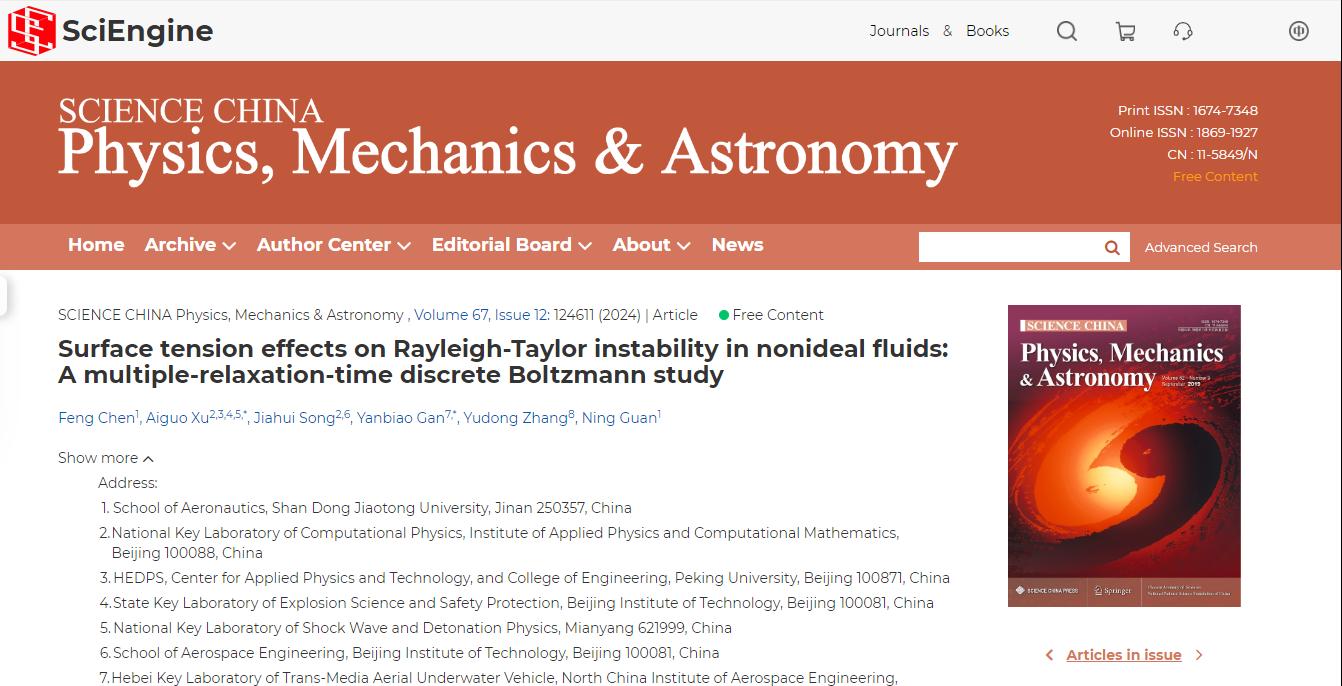近日,我校航空学院陈锋副教授与北京应用物理与计算数学研究所许爱国研究员、北华航天工业学院甘延标教授等在国际顶级期刊《SCIENCE CHINA-Physics Mechanics & Astronomy》合作发表题为“Surface tension effects on Rayleigh-Taylor instability in nonideal fluids: A multiple-relaxation-time discrete Boltzmann study”的研究论文,报道了他们在流体界面不稳定性动理学研究方面的新进展。