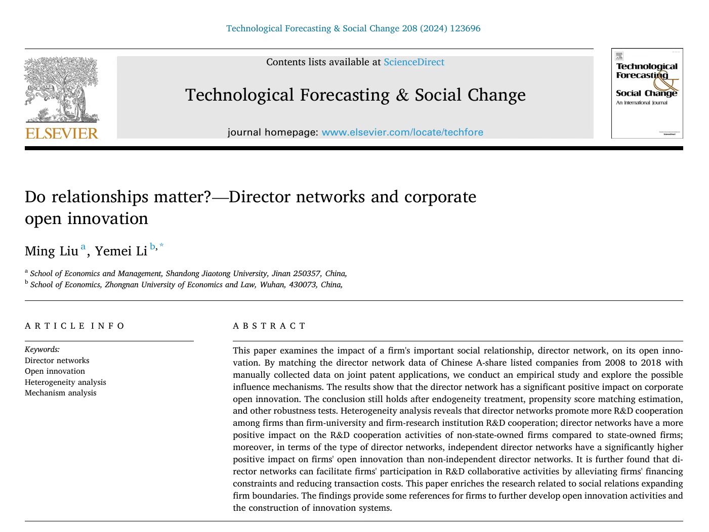 近日,我校经济与管理学院青年教师刘铭,以第一作者身份在创新管理领域国际权威学术期刊《Technological Forecasting and Social Change》发表了题为《Do relationships matter?-Director networks and corporate open innovation》的研究论文。