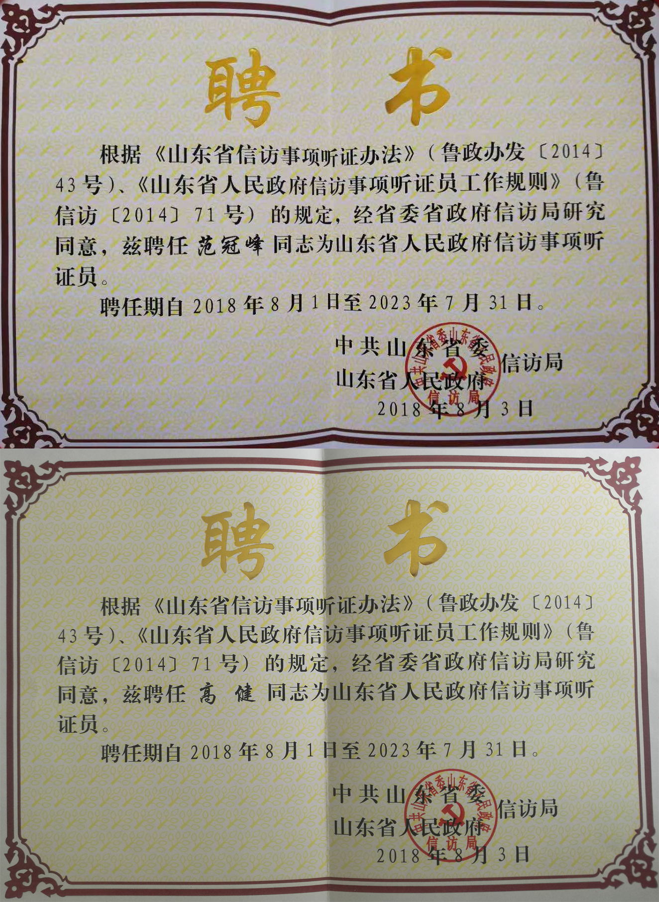 近日,根据《山东省信访事项听证办法》和《山东省人民政府信访事项听证员工作规则》规定,经省委省政府信访局研究同意,决定聘任我校交通法学院的范冠峰教授和司法鉴定中心的高健副教授为山东省人民政府信访事项听证员,聘任期自2018年8月至2023年7月。