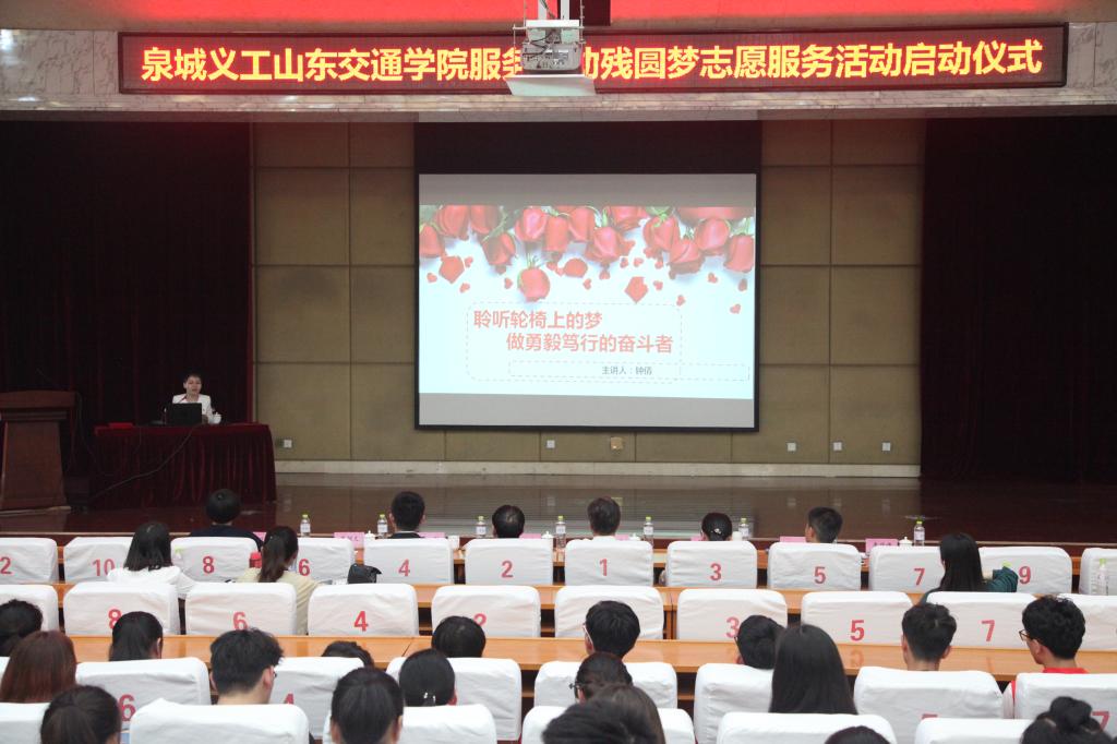 为进一步推进文明校园创建工作,弘扬“奉献、友爱、互助、进步”的志愿服务精神,在大学生中形成“人人皆愿为,人人皆可为,人人皆能为”的志愿服务理念,5月15日下午,我校在长清校区学术报告厅举行“雪樱计划”——泉城义工LT.COM乐投服务团助残圆梦志愿服务活动启动仪式。活动邀请到中国好人、全国百姓学习之星、全国向上向善好青年钟倩同志。党委副书记唐勇出席仪式,党委教师工作部部长刁艳飞主持仪式。