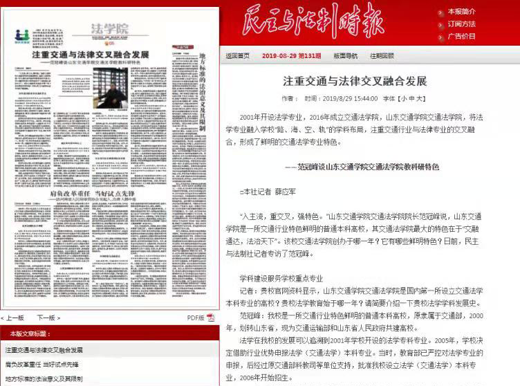 近日,《民主与法制时报》以《交通与法律交叉融合发展》为题,用半个版面的篇幅全面报道了我校法学专业的办学特色。
