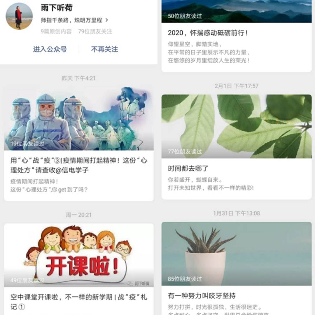 “合”战力,铺设担当“爱心路”。目前,学院师生形成合力,扎实推进疫情防控工作往实里落、往细里落、往心里落。1月29日,学院分党委副书记张玉霞开通个人微信公众号“雨下听荷”——师指千条路,烛明万里程。以原创推文、图文动漫等形式,讲述战“疫”感人事迹、传播防控科学知识,并开展远程学习交流,架起沟通的桥梁,广受学生好评。公众号上线21天,每日一更,从未中断,正面发声弘扬主旋律,思想引导传播正能量。辅导员们多方举措引导学生践行“我是信电人,我承诺”、“疫情防控,志愿先行”;创新方式激发学生家国情怀,“绘笔传情”引导学生用绘笔传达心意,用作品表达祝福,“声入人心”号召学生用声音传递温暖,用美文寄托情怀;各团支部开展“众志成城 共克时艰”线上主题团日活动,看英雄事迹、学先进榜样,讲“逆行者”故事,引领学生坚定理想信念、锤炼实干精神。