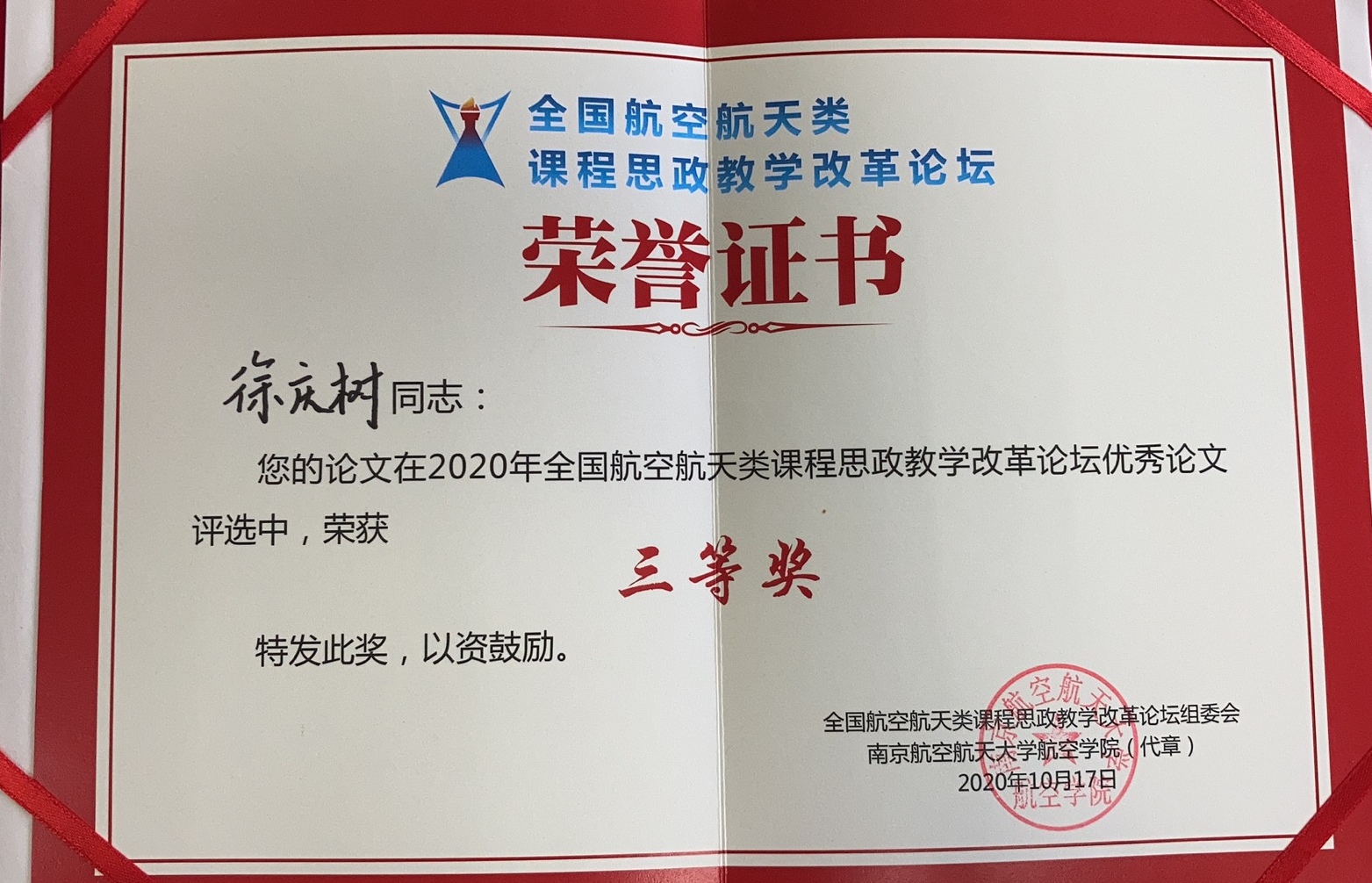 10月17日,全国首届航空航天类课程思政教学改革论坛在南京举办。我校航空学院飞行技术系青年教师徐庆树受邀在分组讨论环节作了论文《基于职业身份认同的课程思政研究——以飞行技术专业为例》的交流发言,该论文获论坛优秀论文三等奖。