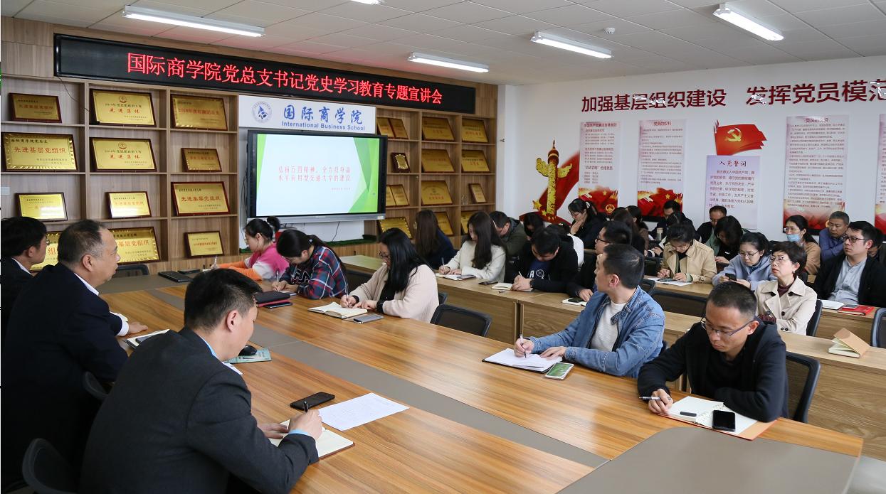 4月28日下午,国际商学院举办党史学习教育宣讲会。学院党总支书记刘佳军结合我校第三次党代会上制定的发展规划以《弘扬五四精神,全力投身高水平应用型交通大学建设》为题进行了宣讲,学院全体教师参加宣讲会。