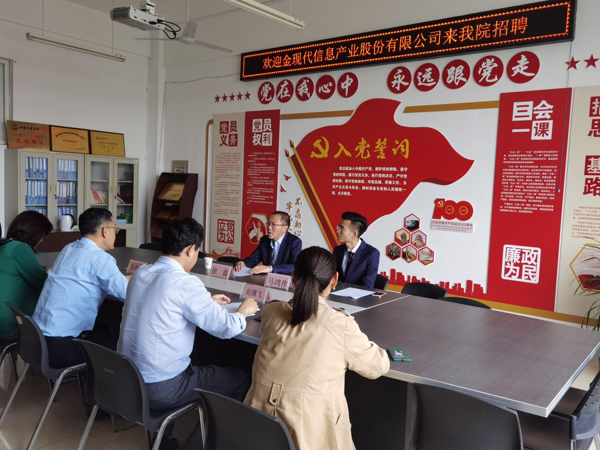 理学院党委书记单宝森结合行业发展与专业特点,毕业生实习与就业情况进行分析交流。金现代信息产业股份有限公司人力资源部总监徐磊就企业情况、人才需求等进行介绍,并希望进一步加强校企合作。双方表示,将进一步加强校企共同合作,为学生实习、就业提供更广阔的空间,充分发挥为社会、为企业服务的功能,更好地为培养素质高、技能强的应用型人才而共同努力。