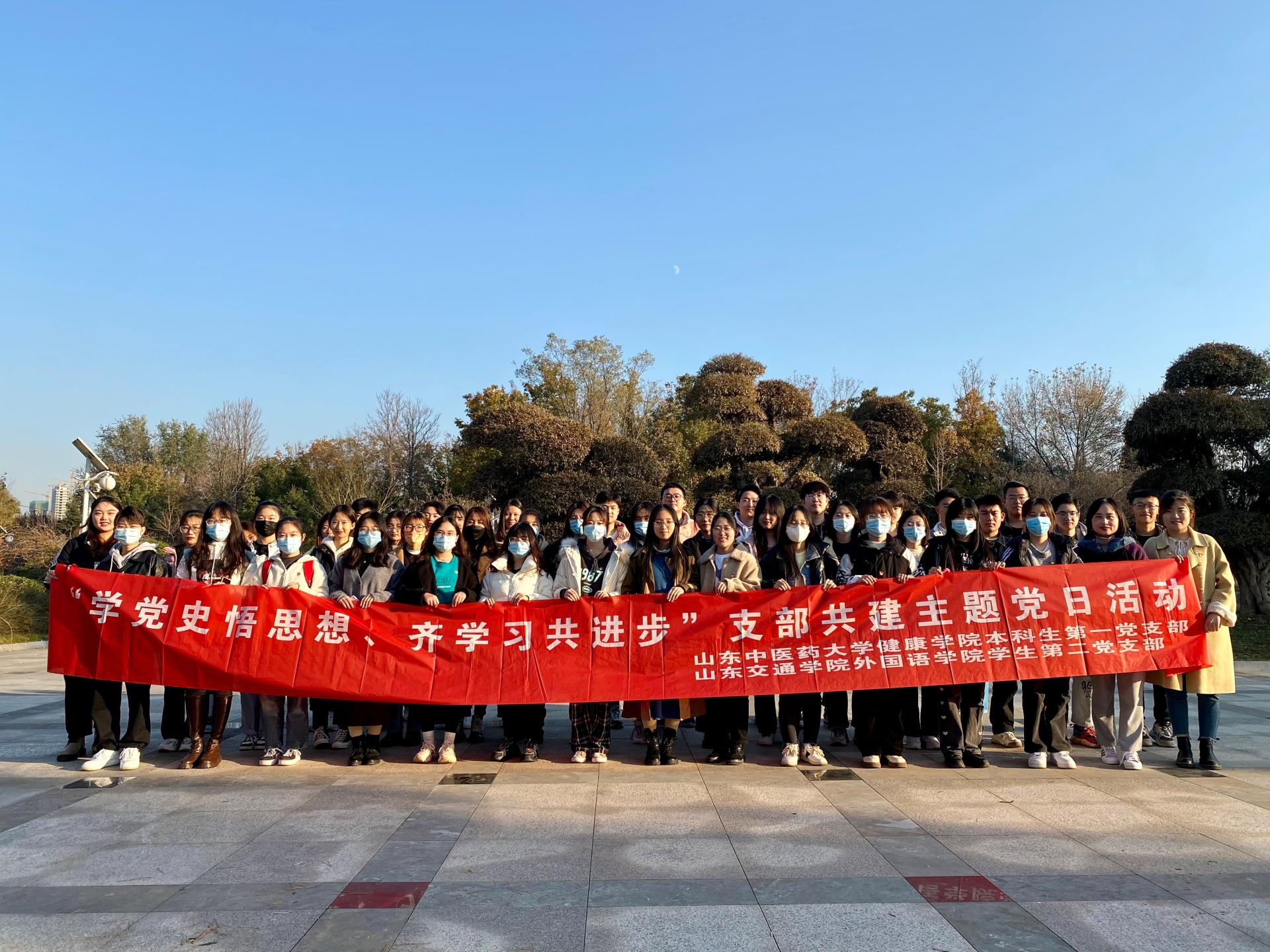 为提升党支部标准化规范化建设水平,发挥其战斗堡垒作用,推进党史学习教育走实走深,11月12日下午,外国语学院学生第二党支部与山东中医药大学健康学院本科生第一党支部共赴长清区园博园开展“学党史悟思想、齐学习共进步”支部共建主题党日活动。