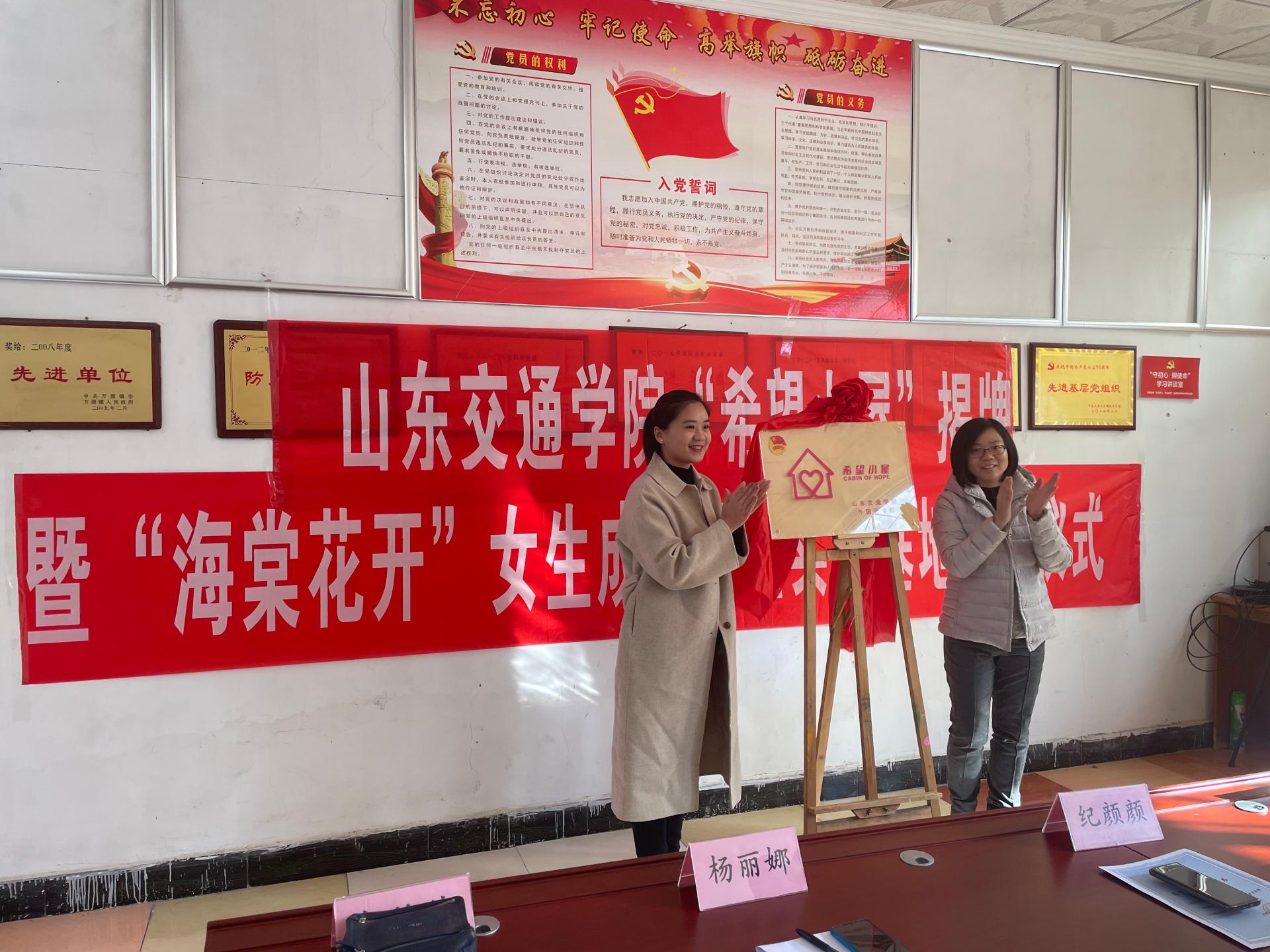 11月12日下午,外国语学院捐赠“希望小屋”揭牌暨“海棠花开”女生成长驿站实践基地启动仪式在长清区万德街道张庄村村委会举行。共青团长清区委副书记纪颜颜、学校挂职团委副书记杨丽娜、长清区教体局团委书记崔琳、长清区第五初级中学相关领导参加活动。