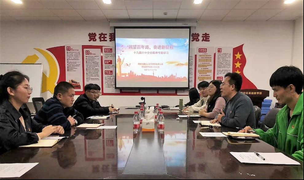 基础教学部政治教研室教师于妲带领全体党员进行党的十九届六中全会精神专题学习,深入了解全会上审议通过的《中共中央关于党的百年奋斗重大成就和历史经验的决议》。与会党员围绕深入学习贯彻党的十九届六中全会精神作交流发言。大家一致认为,要把党百年奋斗的宝贵经验坚持好、运用好、发扬好,坚守为党育人、为国育才初心使命,落实立德树人根本任务,在实际工作中大力弘扬伟大建党精神,埋头苦干、勇毅前行,坚定不移跟党走,为扎实推动学校高质量发展作出新的更大贡献。