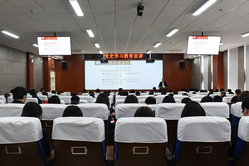 在第二报告厅,陈松岩以《重温百年党史,感悟辉煌逻辑》为题,为威海校区师生党员作党史学习教育专题宣讲报告。他深刻阐明了开展党史学习教育的目的要求、重大意义和重点内容,系统梳理了党在不同历史时期成功应对风险挑战的宝贵经验和系列启示,总结分享了自己在党史学习教育中的心得体会。他指出,党史百年的苦难辉煌证明中国共产党领导全国人民取得新民主主义革命的胜利建立新中国,进行社会主义革命和建设,开辟中国特色社会主义道路是历史发展的必然趋势,是马克思主义基本原理不断同中国具体实际相结合的历史进程,是科学社会主义理论逻辑和中国社会发展历史逻辑的辩证统一。