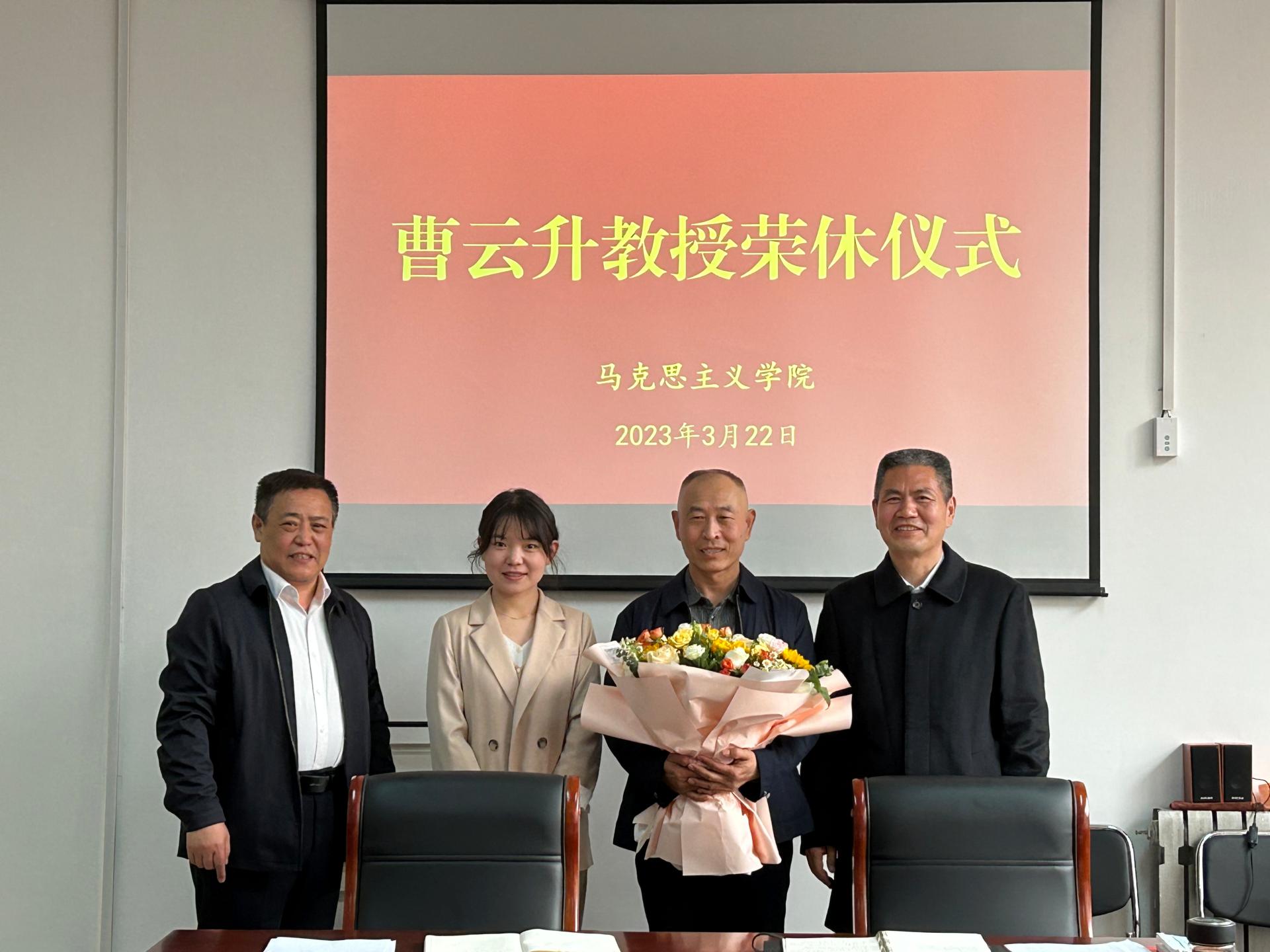 3月22日,马克思主义学院在长清校区综合实验楼231会议室为学院退休教授曹云升举行荣休仪式。马克思主义学院党总支书记林源,党总支副书记、院长杜永明参加仪式。仪式由杜永明主持。