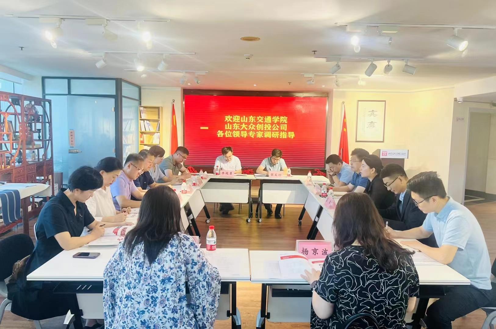 在山东文化产权交易所有限公司,山东文化产权交易所有限公司董事长耿人强、总经理孟敏、副总经理李鸣,山东大众创业投资有限公司总经理杨晓白参加了座谈会。耿人强对滕怀国一行的到访表示热烈欢迎,介绍了公司开展的特色党建活动。孟敏、李鸣、杨晓白分别介绍了山东文化产权交易所有限公司、山东(济南)文化金融服务中心、山东大众创业投资有限公司的发展、运营以及人才需求情况。滕怀国对山东文化产权交易所有限公司的热情接待表示衷心感谢,结合学院特色优势,从党建思政、决策咨询、科研互促、专业共建、实习就业等方面阐述了未来双方合作的发力点。双方一致表示,要以此次调研为契机,加强交流,实现资源共享、优势互补,共同为山东省推动优秀传统文化创造性转化、创新性发展贡献力量。