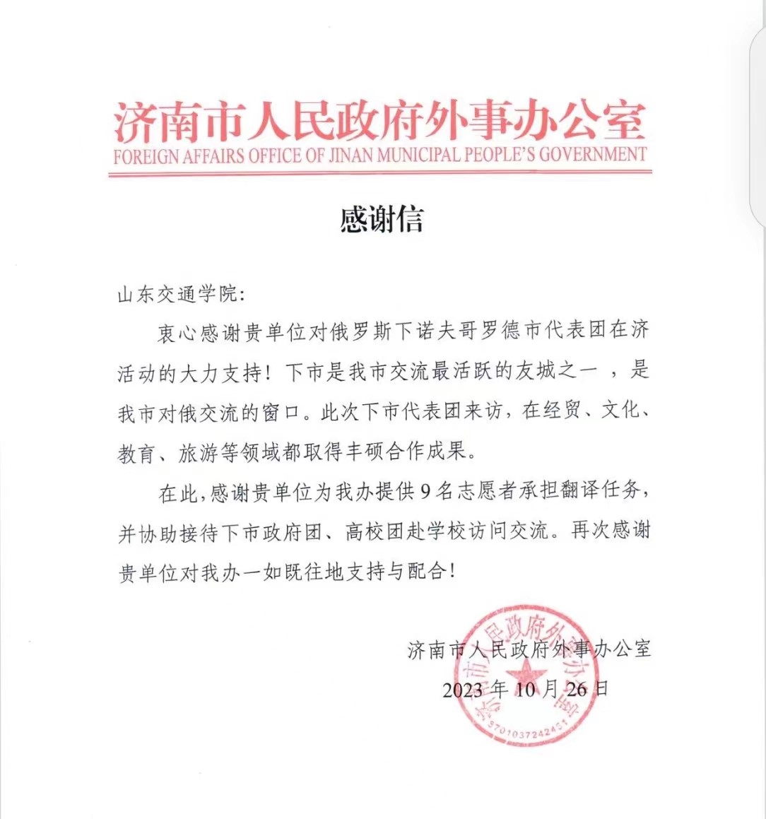 近日,学校收到来自济南市人民政府外事办公室发来的感谢信,对我校积极支持帮助俄罗斯下诺夫哥罗德市代表团在济活动表示充分肯定和诚挚感谢。