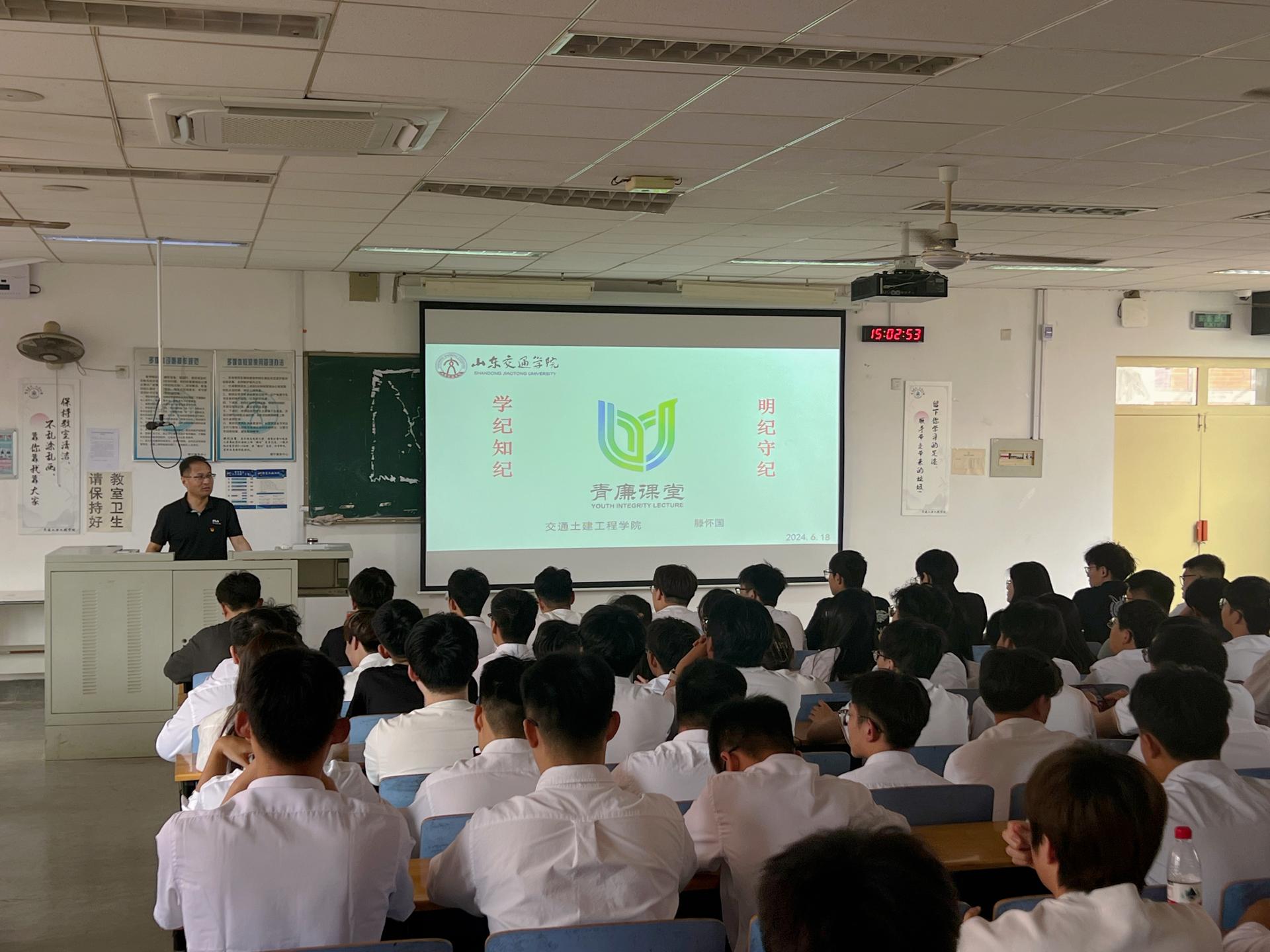 交通土建工程学院党委开展“青廉课堂”暨讲授纪律党课活动。党委书记滕怀国为全体毕业生党员讲授纪律党课,他以“守牢规矩纪律底线,做学纪、知纪、明纪、守纪的先锋”为题,从“想要想得合理”“比要比得恰当”“干要干得实在”“行要行得端正”“活要活得充实”等五个方面,引导毕业生党员时刻牢记党的纪律,自觉遵守和捍卫党的纪律,修身做人、立言立行,以实际行动为中国特色社会主义现代化建设铺路架桥。