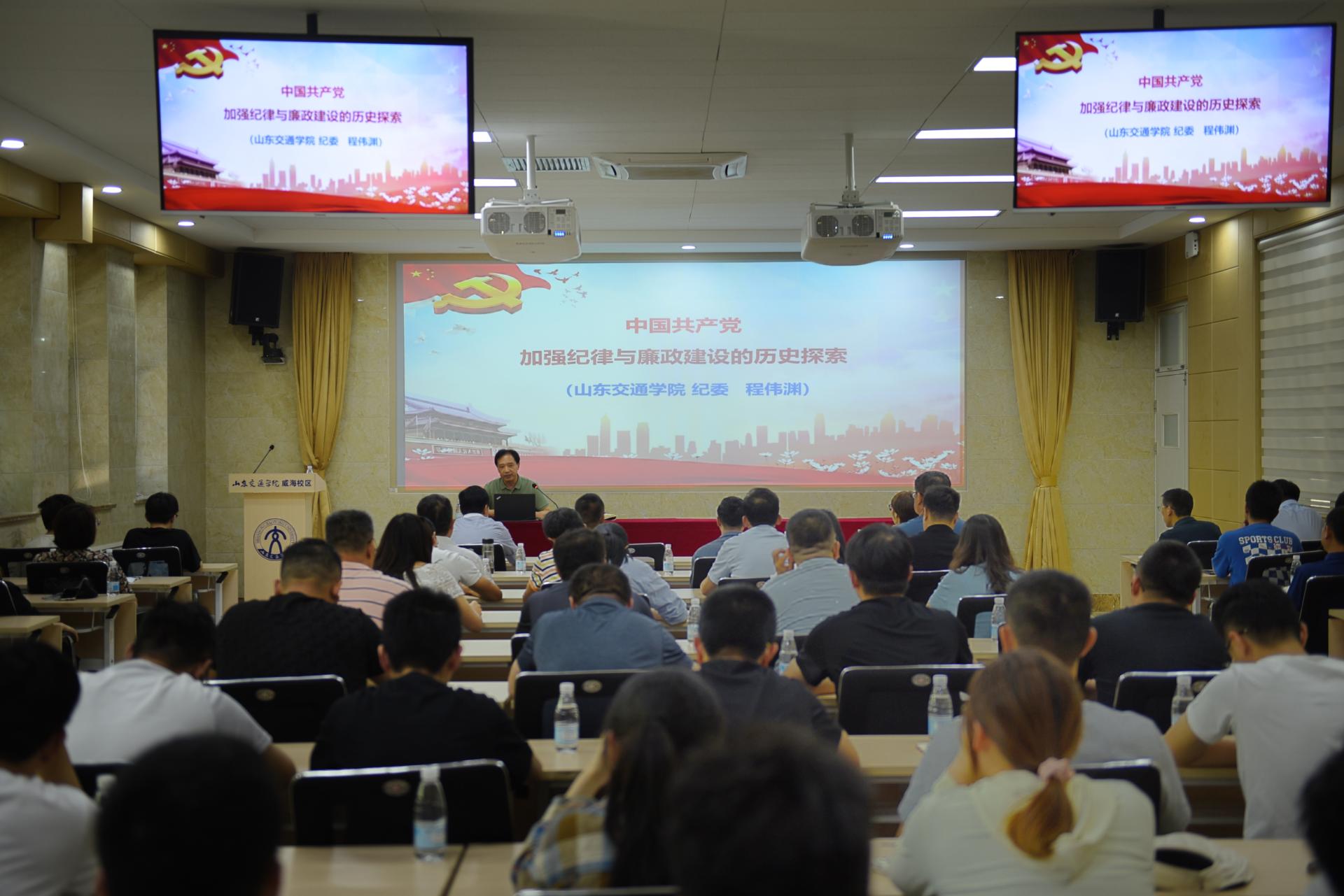 威海校区机关党委邀请学校纪委副书记程伟渊在明德楼第一报告厅为威海校区机关全体党员干部讲授纪律党课,学校纪委(监察专员办公室)正处级纪检员兼威海校区纪检监察办公室主任张国勇主持活动。程伟渊以《中国共产党加强纪律与廉政建设的历史探索》为题,回顾了中国共产党党风廉政建设和反腐败斗争的艰辛历程,总结了中国共产党纪律建设和廉政建设的历史经验,系统讲解了新修订的《中国共产党纪律处分条例》,提出加强新时代廉洁文化建设的思考。威海校区机关党员干部纷纷表示,要进一步强化党纪意识,以严明纪律锤炼过硬作风,提振干事创业精气神。