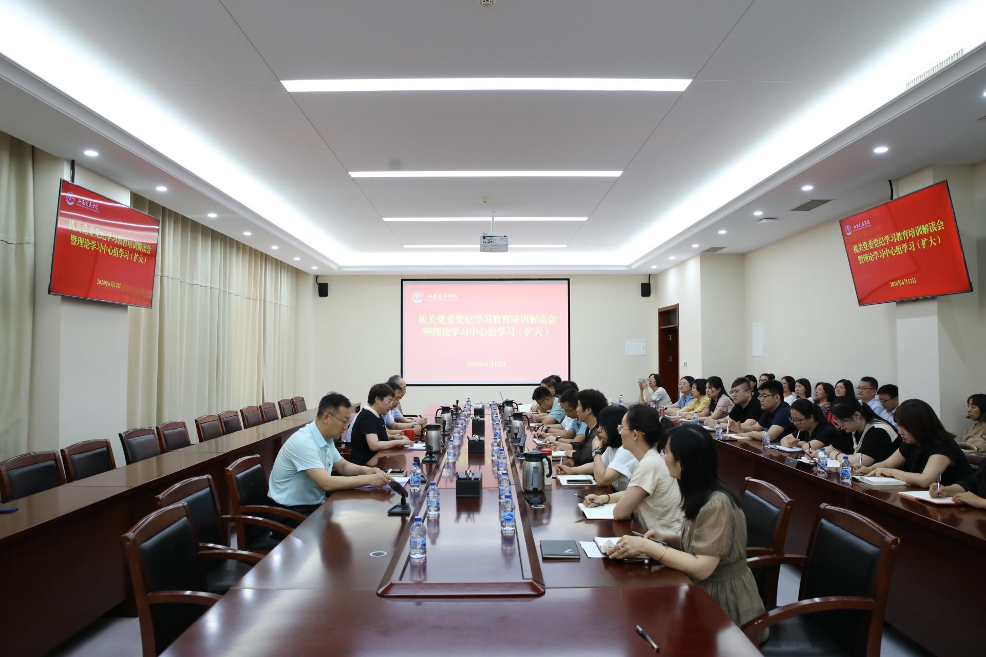 6月12日下午,机关党委在长清校区明德楼301会议室举办党纪学习教育培训解读会暨党委理论学习中心组(扩大)集体学习,邀请学校纪委副书记、机关党委纪检委员程伟渊为机关干部作纪律培训。会议由机关党委书记闫荣双主持。