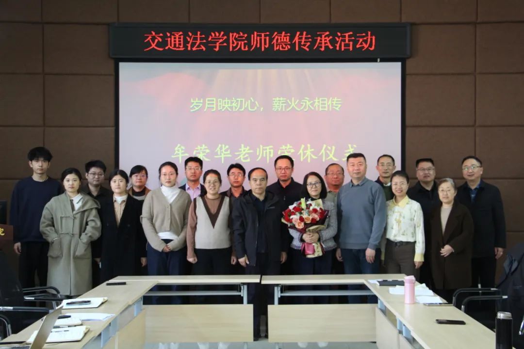 交通法学院举行牟荣华老师荣休暨优良师德师风传承仪式。活动中,师生共同观看视频,回忆了牟荣华老师的工作经历和校园生活;党委书记闫淼代表学院向牟荣华送上祝福,院长范冠峰向牟荣华赠送退休礼物,校友代表为牟老师献上鲜花,与会师生深情回忆了与牟荣华老师共度的难忘时光。